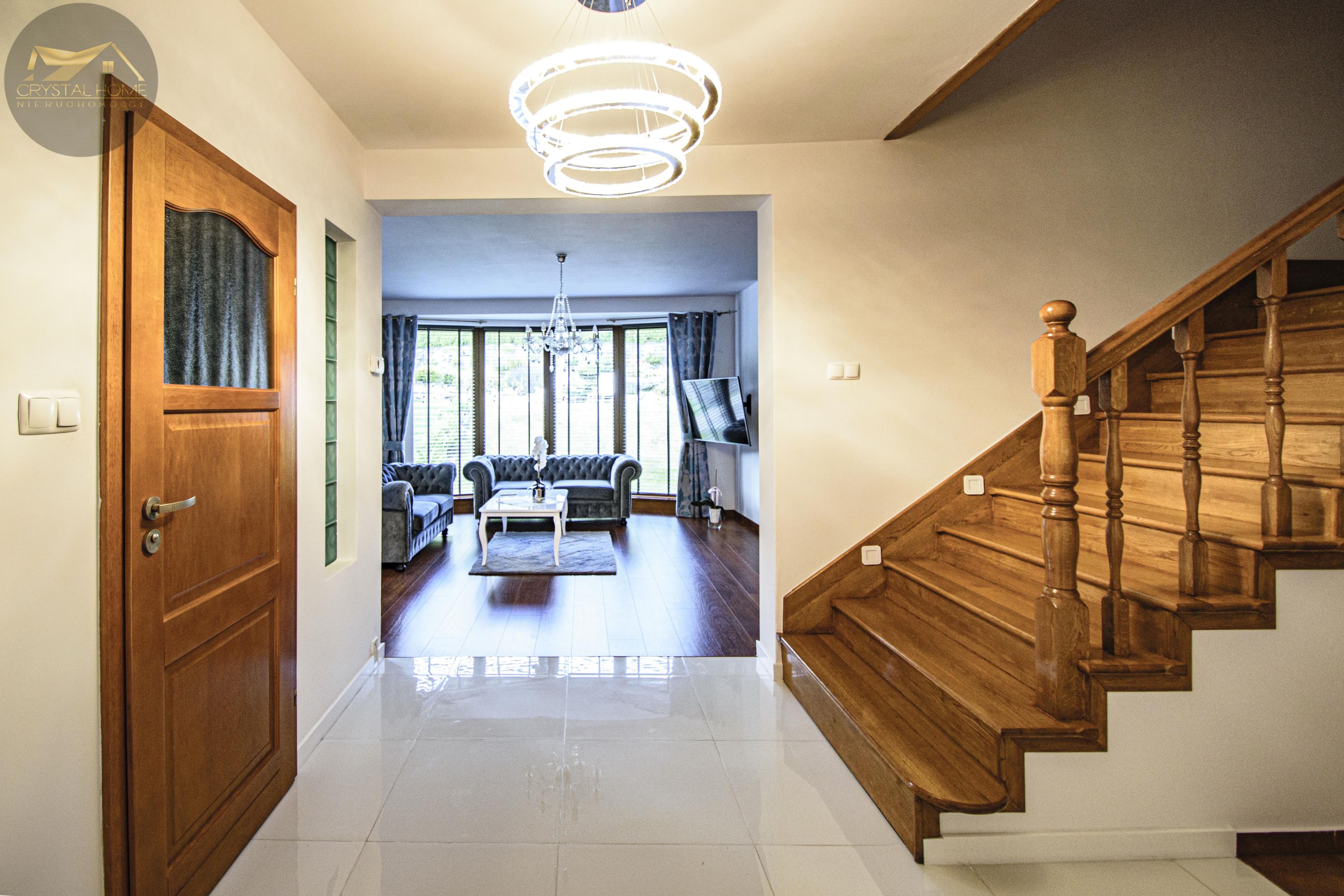 Na podłogach znajdują się eleganckie panele oraz płytki, a drewniane schody dodają wnętrzu ciepła i klasy.