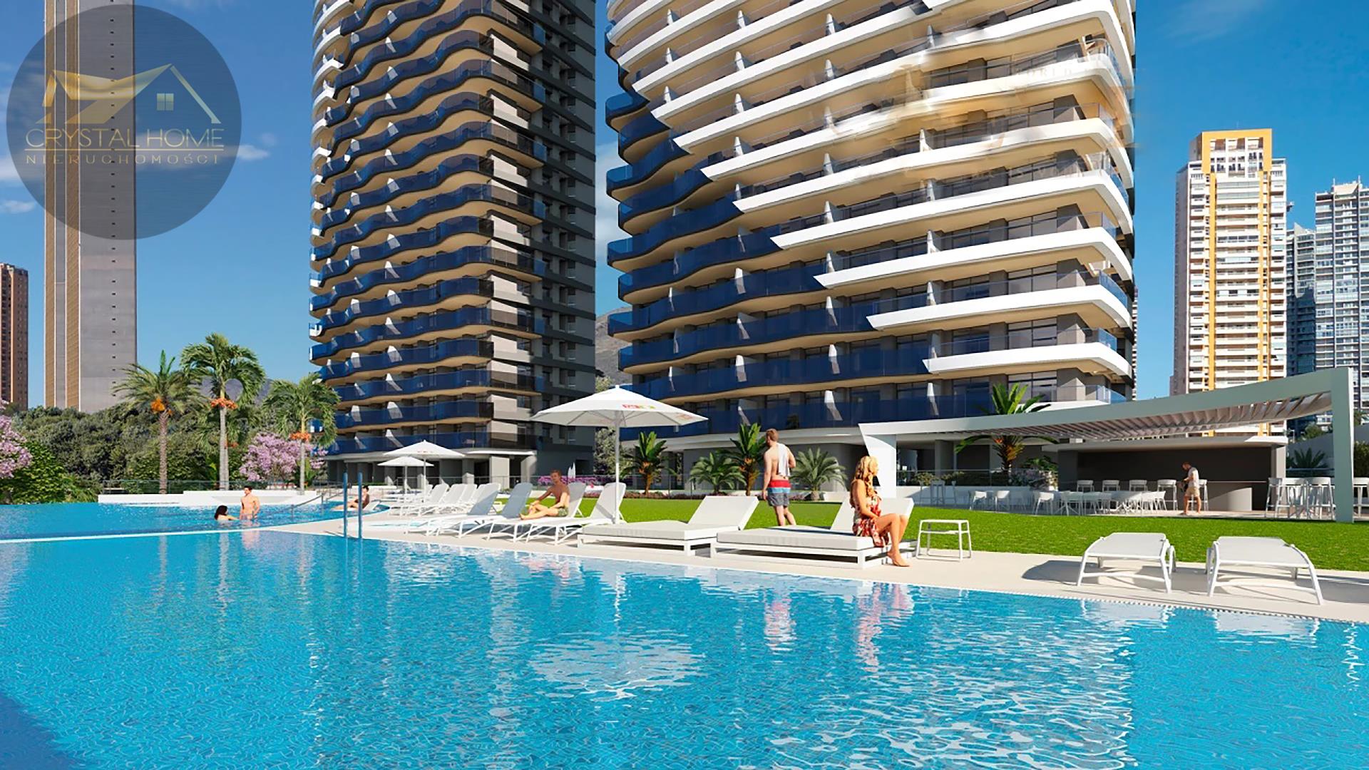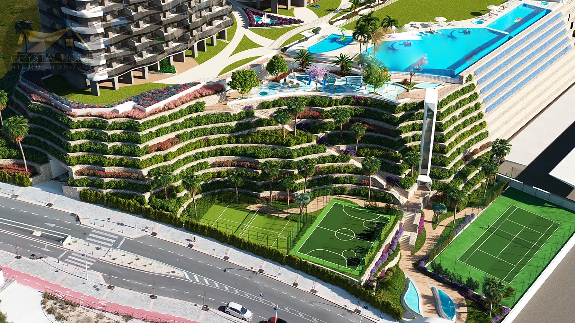 Ten wspaniały kompleks mieszkalny zlokalizowany będzie w drugiej linii Morza Śródziemnego i składać się będzie z 2 imponujących wież ze szklanymi fasadami. Pierwszej 30-piętrowej wieży i drugiej 40-piętrowej wieży, obie zwrócone w stronę południa połączone ze soba doskonale zaprojektowanymi częściami wspólnymi z ogrodami, basenami i wieloma innymi udogodnieniami. Jest to wyjątkowy projekt, który dąży do maksymalnego komfortu mieszkańców i który pozwoli Ci cieszyć się Morzem Śródziemnym jak nigdy dotąd. Tarasy (zadaszone i nieosłonięte) będą wyposażone w szklane balustrady, które pozwolą na kontynuację widoku i cieszenie się nim również od wewnątrz. Do każdego mieszkania przynależy także prywatne miejsce parkingowe w podziemiu oraz komórka lokatorska.
