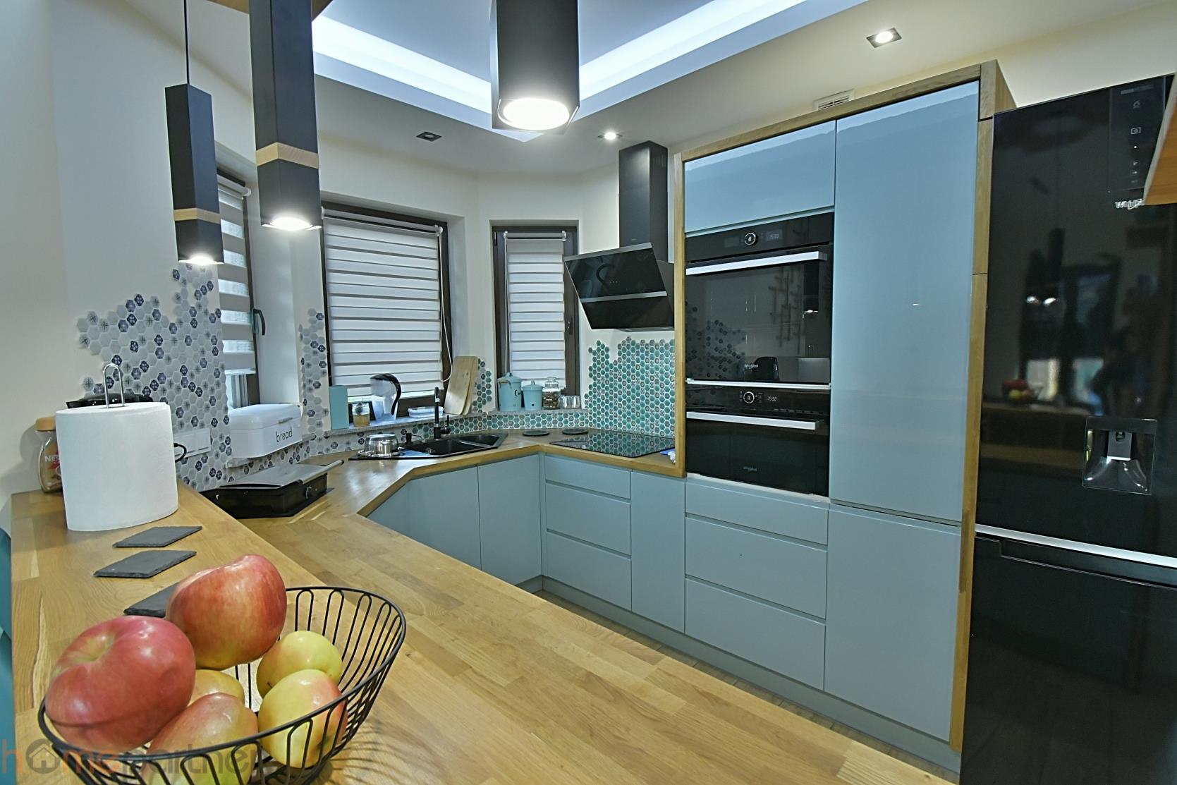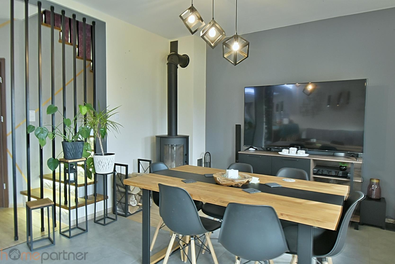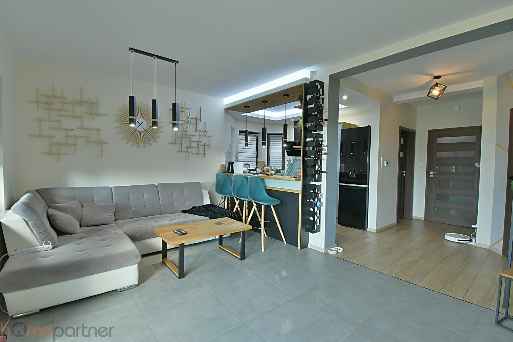 Ustawny salon z zachodnią ekspozycją i z piecem typu koza. Na podłodze na całym dole- kafle. Kuchnia w pełni wyposażona, w sprzęt wysokiej klasy-lodówka, piekarnik, płyta indukcyjna, zmywarka 60 cm, okap, mikrofalówka. Drewniane elementy w salonie (ława, stół) oraz w części kuchennej jednorodne - z drewna dębowego. Na ścianach w klatce schodowej elementy dekoracyjne - zmywalny tynk glinka wenecka. W sypialniach na podłodze panele.