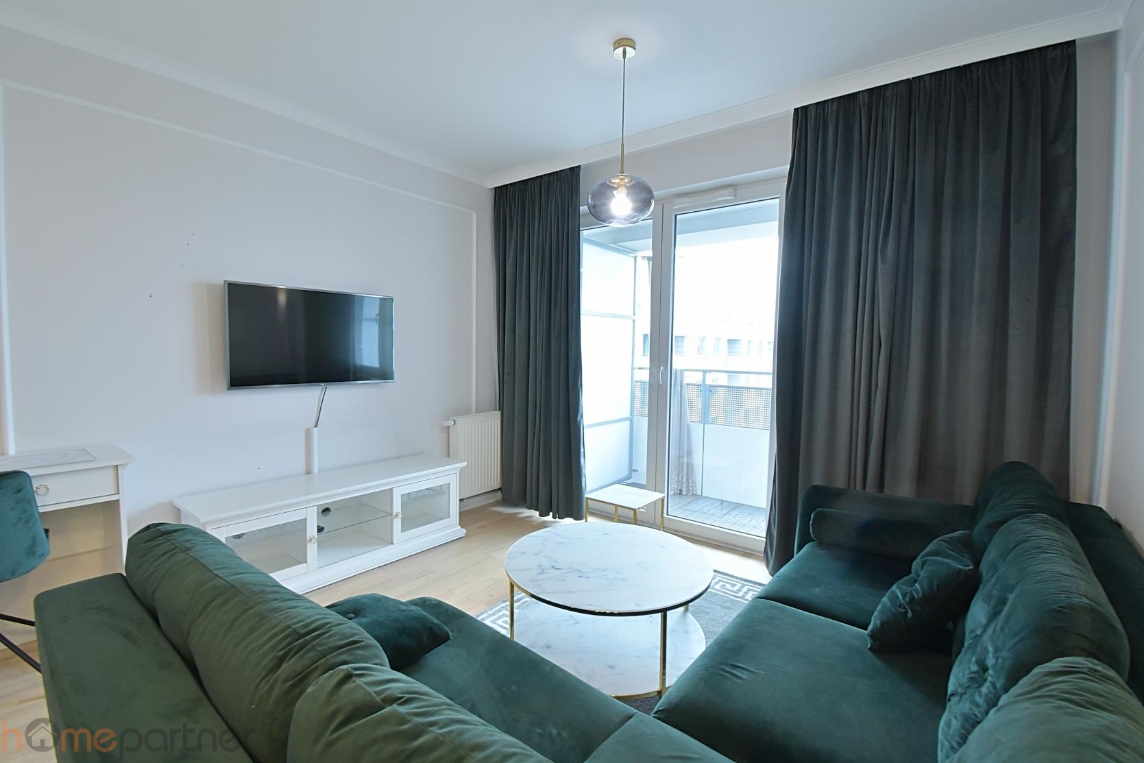 Mieszkanie jest umeblowane i nowocześnie zaaranżowane, wykończone materiałami wysokiej klasy. Kuchnia w zabudowie wyposażona w lodówko-zamrażarkę, płytę indukcyjną, piekarnik, okap oraz zmywarkę 40 cm. Salon kompletnie wyposażony: okrągły, rozkładany stół z czterema krzesłami, duży rozkładany narożnik, stolik kawowy, szafka RTV, biurko z krzesłem. Łazienka z kabiną typu walk-in, pralko-suszarka na wyposażeniu. W sypialni łóżko małżeńskie tzw. kontynentalne ze schowkiem na pościel, duża szafa w zabudowie, toaletka z lustrem, dwie szafki nocne z lampkami. W przedpokoju duża szafa, szafka na buty, siedzisko i videodomofon.