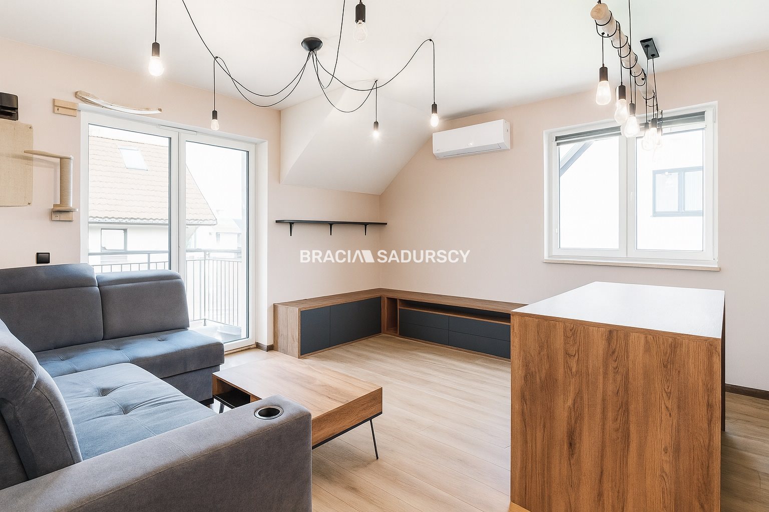 - przestronnego salonu połączonego z aneksem kuchennym oraz wyjściem na balkon,