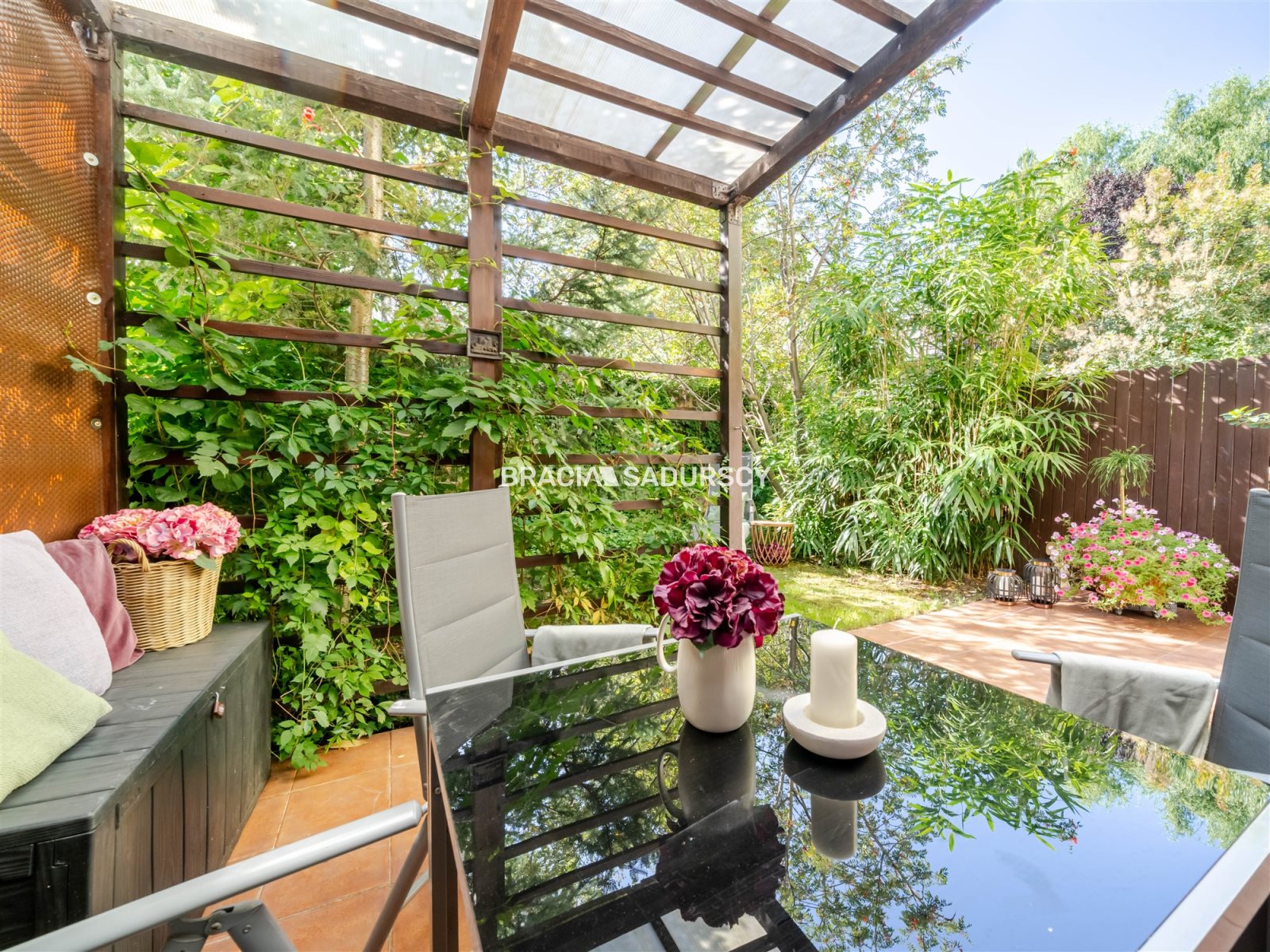 Największym atutem mieszkanie jest klimatyczny, zabudowany taras oraz pięknie zagospodarowany bardzo dużą ilością zieleni; drzew, krzewów i kwiatów ogród.