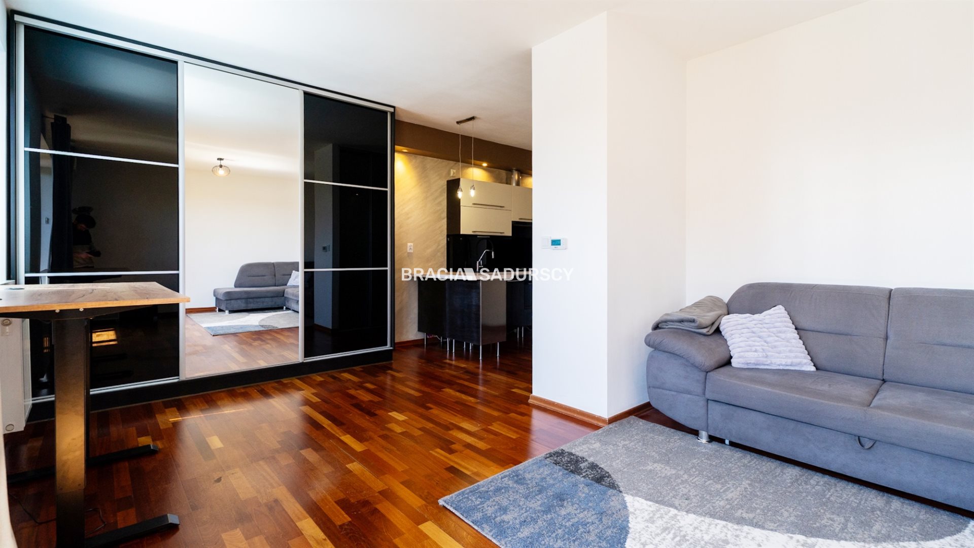 przestronny pokój dzienny z aneksem kuchennym oraz wyjściem na balkon,