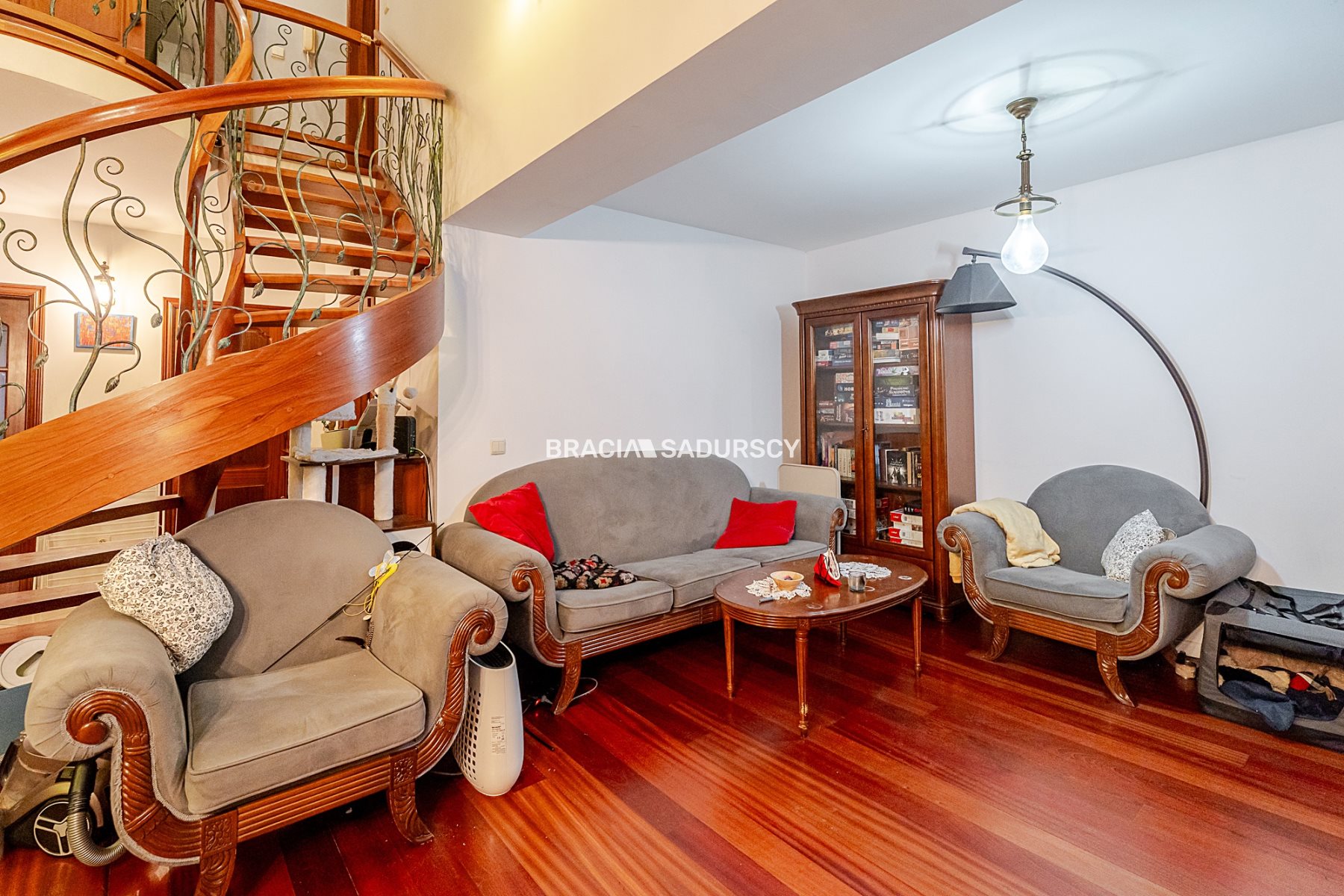 • duży hall ze schodami wykończonymi drewnem egzotycznym na drugi poziom