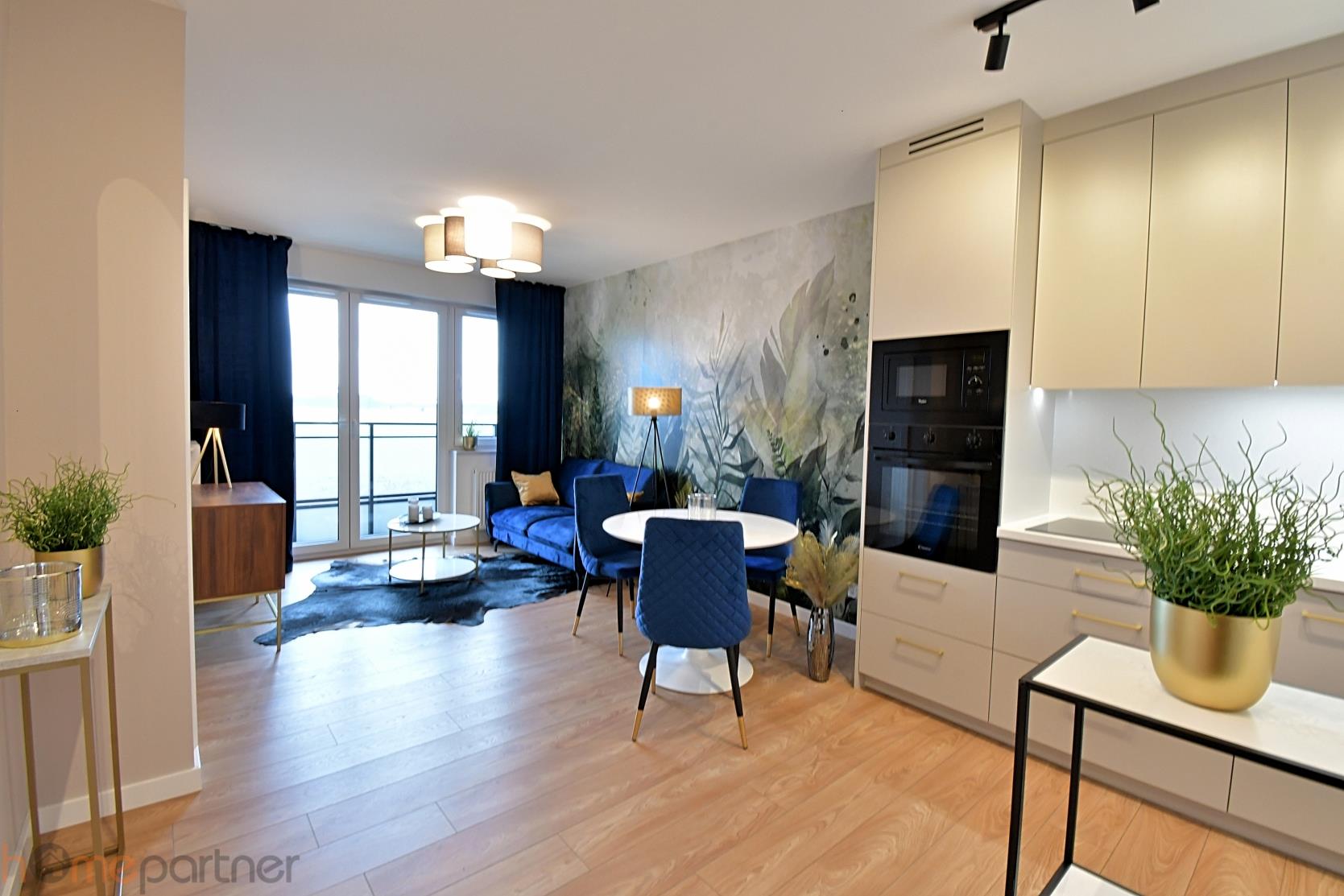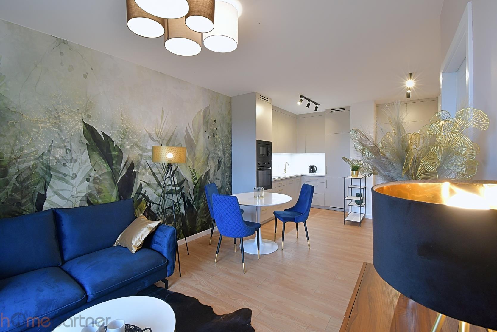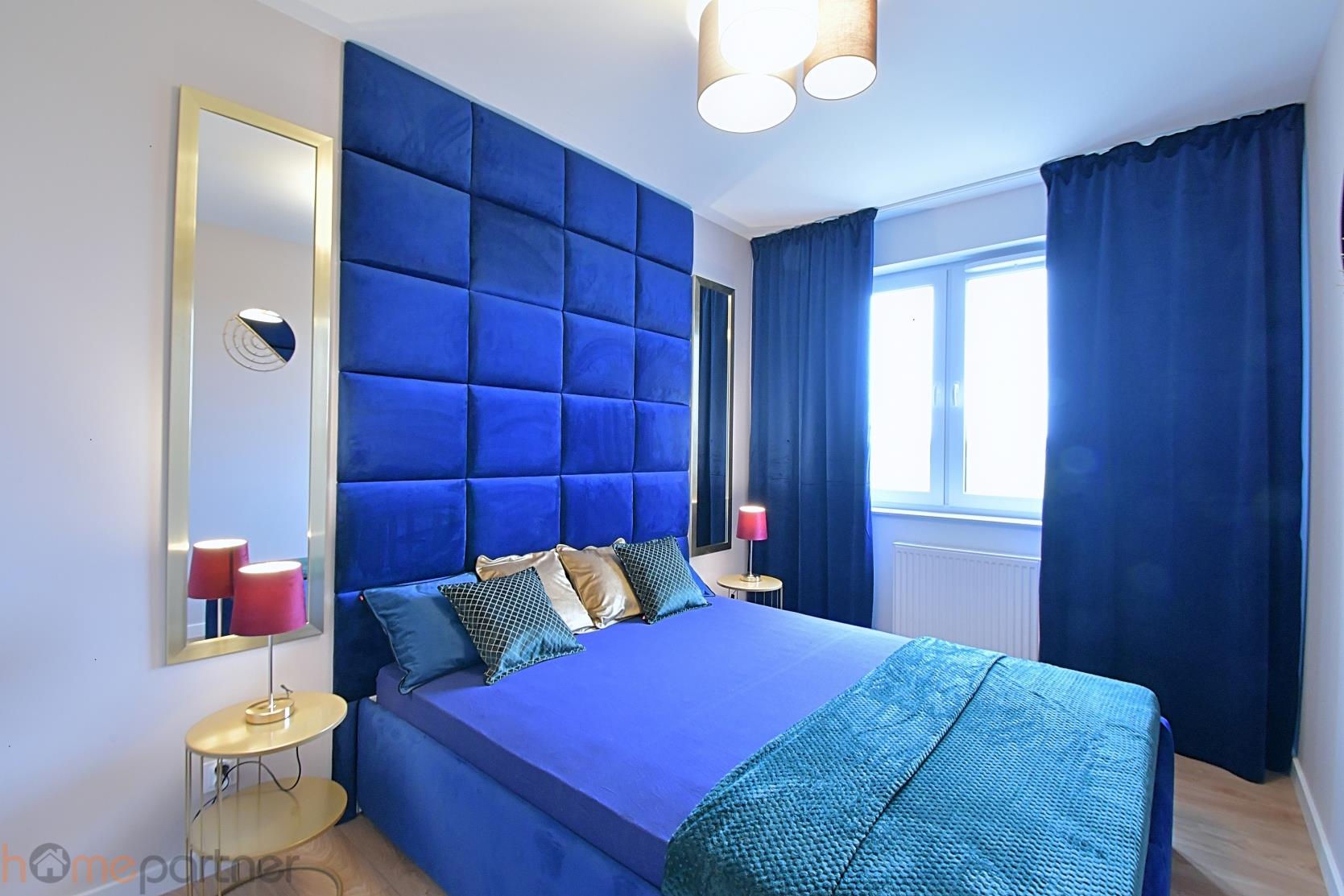 Mieszkanie jest umeblowane i wykończone materiałami wysokiej klasy. Kuchnia w zabudowie wyposażona w lodówko-zamrażarkę, płytę indukcyjną, piekarnik, okap, zmywarkę, mikrofalówkę. Łazienka z wanną, pralka na wyposażeniu. W sypialni łóżko małżeńskie, stoliki nocne i duża szafa. Salon kompletnie wyposażony: sofa (nierozkładana), szafka RTV, stolik kawowy, stół i krzesła.
