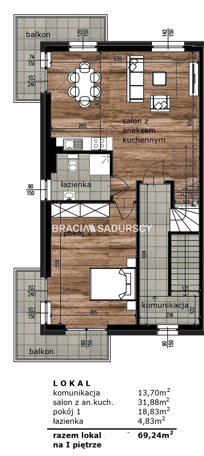 Na poziomie 1 znajdują się dwa balkony.