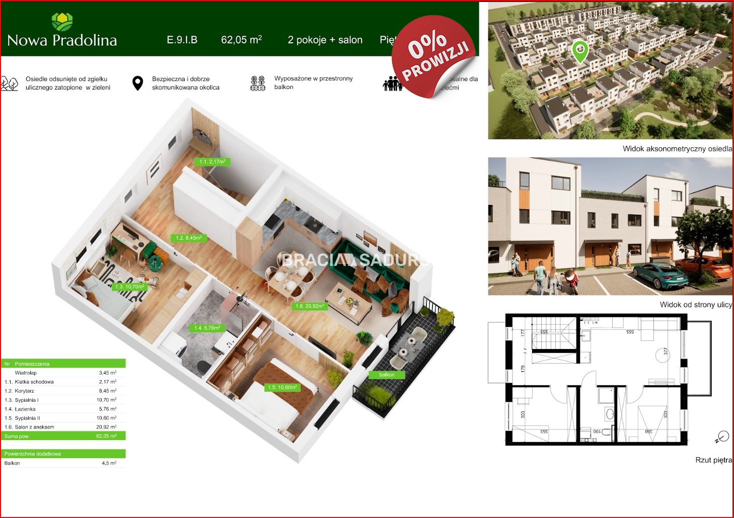 Prezentowane mieszkanie to przestronne, 3 pokojowe mieszkanie na 1 piętrze o pow. 62,05 m 2 . Składa się z salonu z aneksem kuchennym pow. 20,92 m 2 , 2 sypialni o pow. 10,60 m 2 i 10,70 m 2 , łazienki (5,76 m 2 ) oraz wiatrołapu i przedpokoju. Do mieszkania przynależy balkon o pow. 4,5 m 2 .
