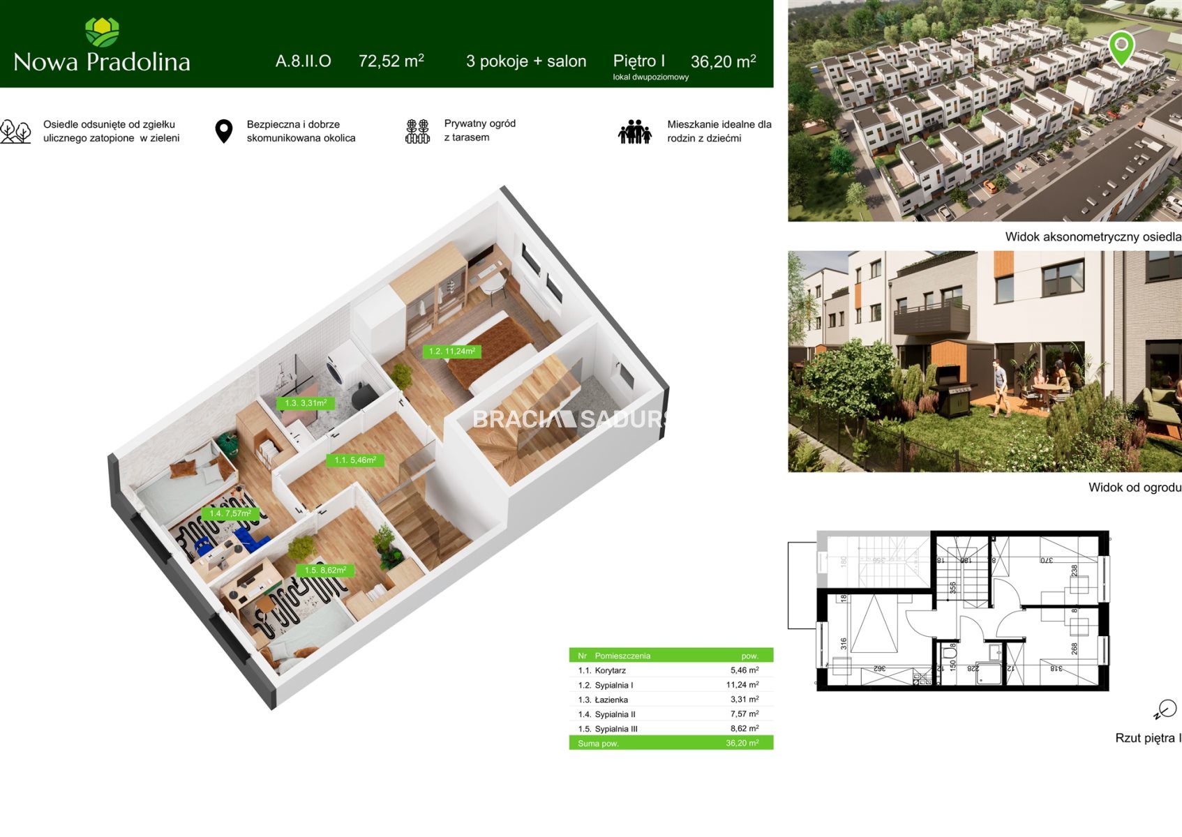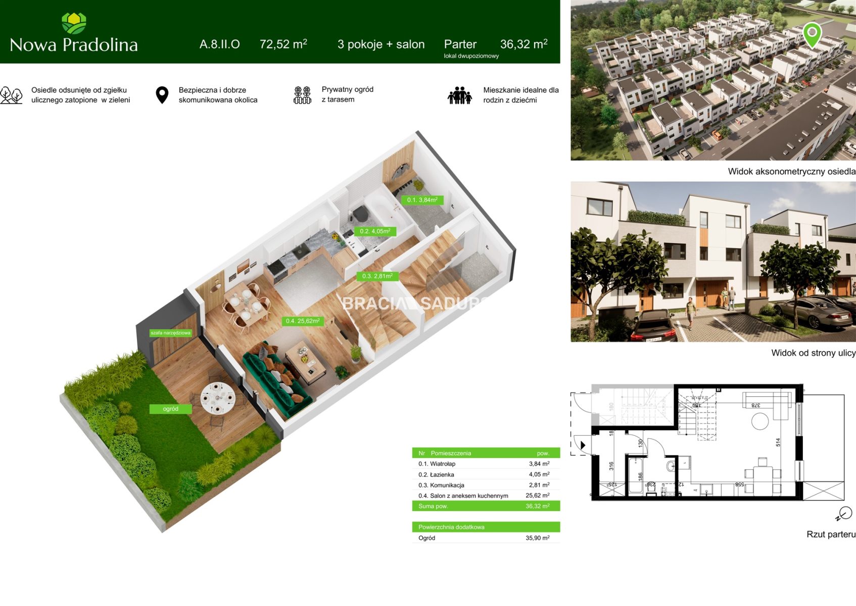 Prezentowane mieszkanie to przestronne, 2 poziomowe, 4 pokojowe mieszkanie na parterze i 1 piętrze o pow. 72,52 m 2 z ogródkiem o pow. 35,90 m 2 .