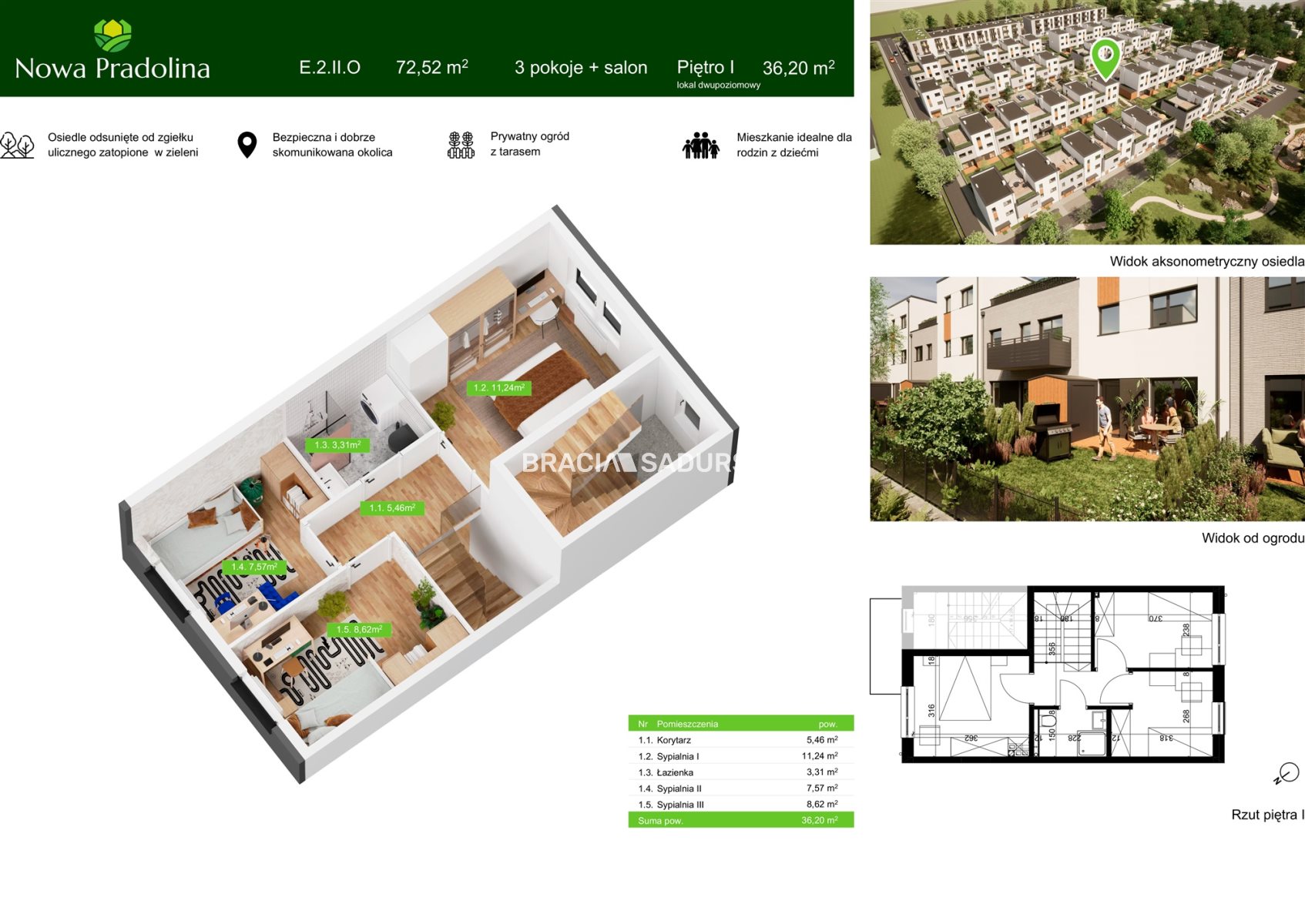 Prezentowane mieszkanie to przestronne, 2 poziomowe, 4 pokojowe mieszkanie na parterze i 1 piętrze o pow. 72,52 m 2 z ogródkiem o pow. 36,80 m 2 . Na poziomie parteru znajduje się salon z aneksem kuchennym o pow. 25,62 m 2 , łazienka (4,05 m 2 ) oraz wiatrołap i przedpokój. W ogródku komórka narzędziowa. Na 1 piętrze znajdują się 3 pokoje (11,24 m 2 ; 8,62 m 2 i 7,57 m 2 ), łazienka (3,31 m 2) oraz przedpokój.