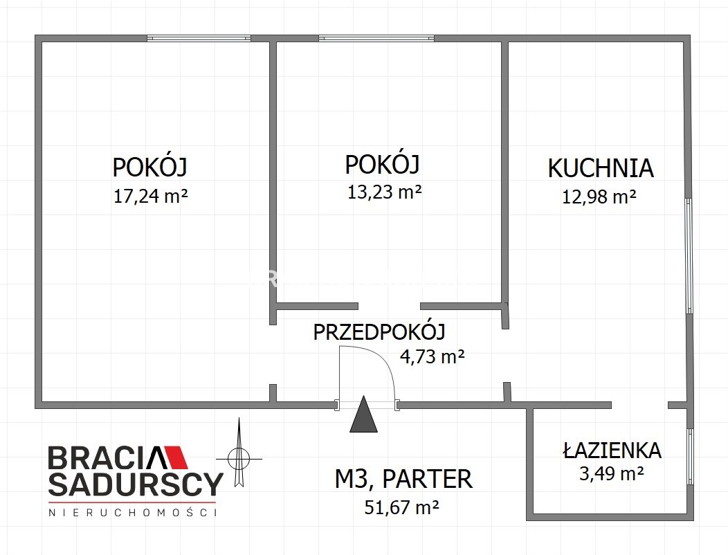 Oferta dotyczy mieszkania o pow. 52,49 m 2 . Mieszkanie na 1 piętrze, narożne, składa się z pokoju dziennego (17,45 m 2 ), sypialni (15,09 m 2 ), kuchni z jadalnią (12,53 m 2 ), łazienki (3,09 m 2 ) oraz przedpokoju (4,33 m 2 ).