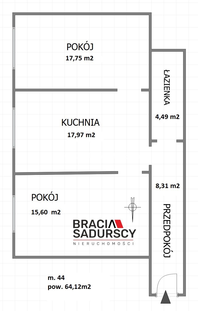 Oferta dotyczy mieszkania o pow. 64,12 m 2 . Mieszkanie na parterze, narożne, składa się z pokoju dziennego (17,75 m 2 ), sypialni (15,16 m 2 ), kuchni z jadalnią (17,97 m 2 ), łazienki (4,49 m 2 ) oraz przedpokoju (8,31 m 2 ).