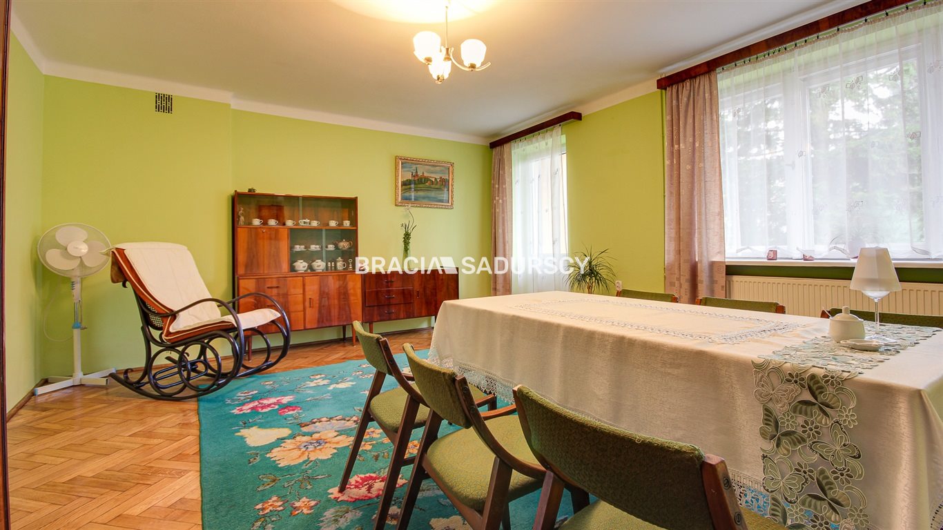 Dom składa się z dwóch niezależnych kondygnacji, oraz piwnicy z garażem. W budynku znajdują się cztery pokoje, dwie kuchnie i dwie łazienki. Pokoje są przestronne, ustawne wyłożone parkietem na parterze oraz panelami na piętrze. W kuchniach jak i łazienkach terakota. Na poziomie piwnic znajduję się duży garaż o pow. 30,70 m 2 oraz pomieszczenia gospodarcze. Budynek położony jest na ogrodzonej i zagospodarowanej działce o powierzchni 741 m 2 , krótszym bokiem ok 20m przylegającym do drogi.