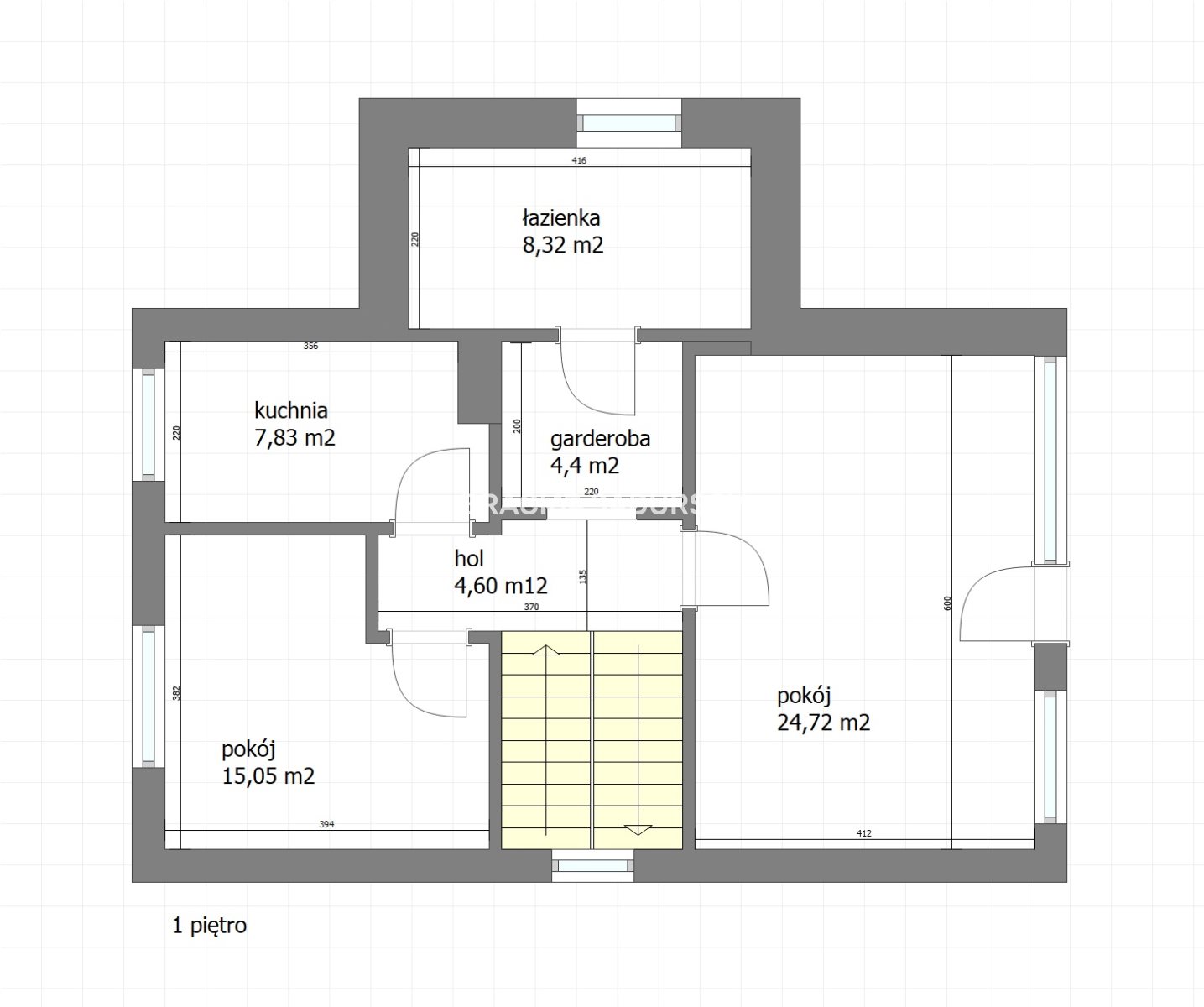 - piętra o pow.: 64,92 m 2 , zawierającego: hol (4,60 m 2 ), garderobę (4,40 m 2 ), łazienkę (8,32 m 2 ), pokój (15,05 m 2 ) i pokój (24,72 m 2 ) z wyjściem na balkon.