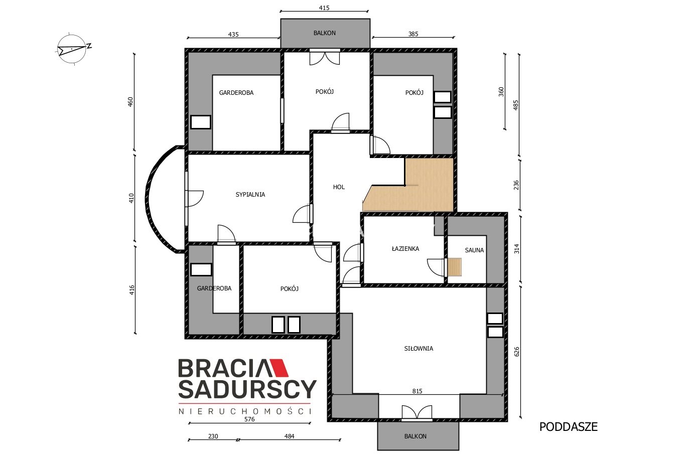 Na poziomie poddasza znajduje się: hall ( 23,96 m 2 ), łazienka o pow.: 9,23 m 2 połączona z sauna ( 7,66 m 2 ), siłownia o pow.: 40,83 m 2 ), pokój ( 22 , 35 m 2 ) z garderobą ( 4,80 m2 ), pokój o pow. 12,38 m 2 , oraz pokój o pow. 14,83 m 2 połączony z sypialnią ( 10,14 m 2 ).
