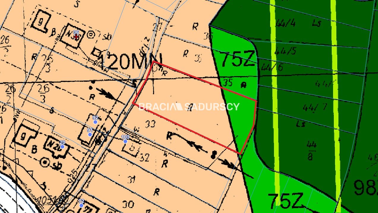 Działka w miejscowym planie zagospodarowania przestrzennego oznaczona jako 120 MN czyli tereny zabudowy jednorodzinne j oraz 75 Z czyli tereny zieleni nieurządzonej. Na część budowlaną przypada około 22 ary, zieleń stanowi około 5 arów. Teren zieleni nieurządzonej jest na końcu działki.