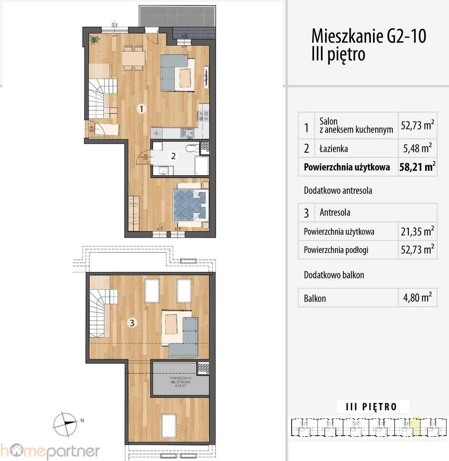 - antresola, dająca możliwość podziały na 2 pokoje (powierzchnia użytkowa 21,35 m),
