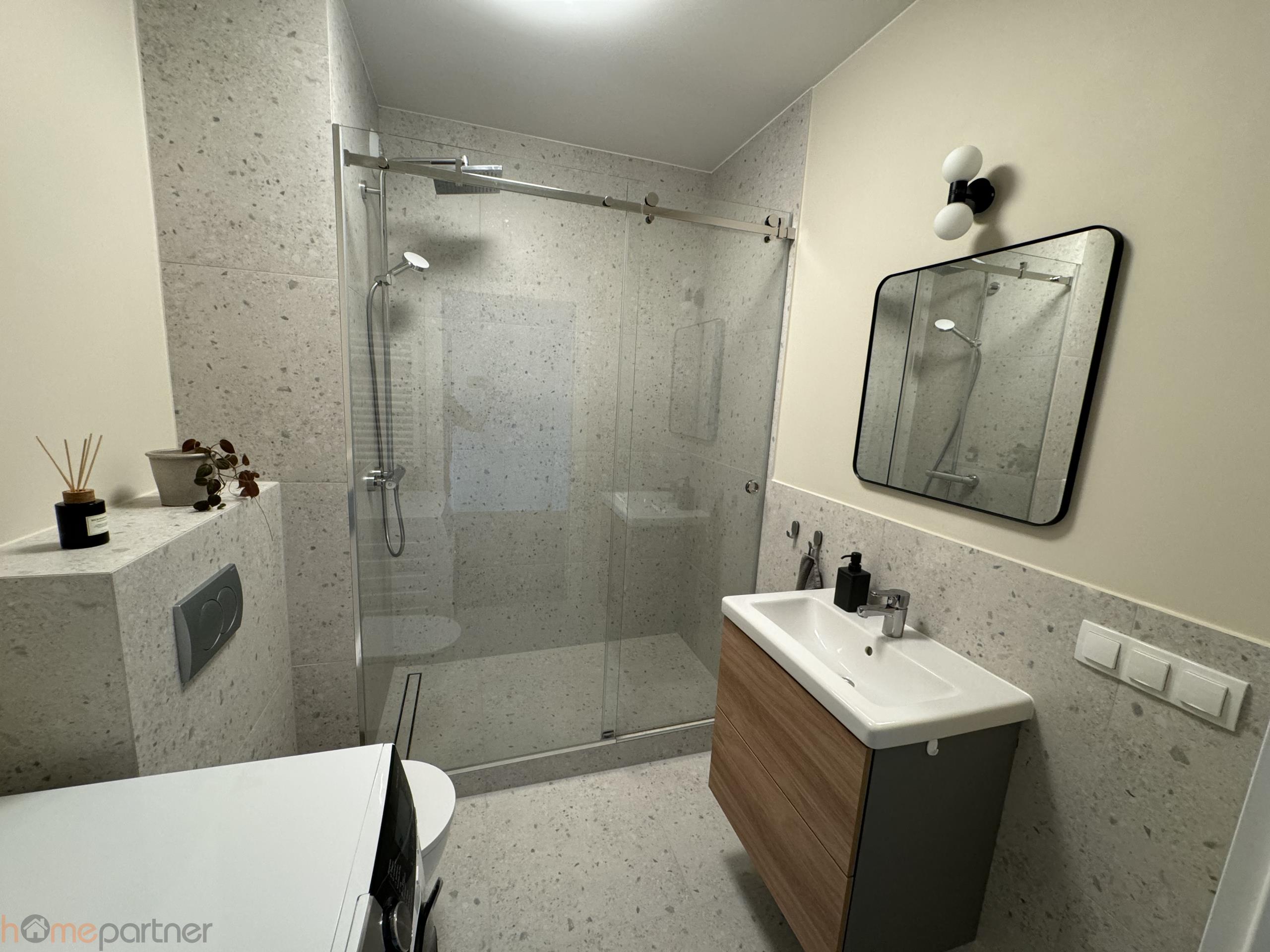 Łazienka z natryskiem, pralko-suszarka na wyposażeniu.
