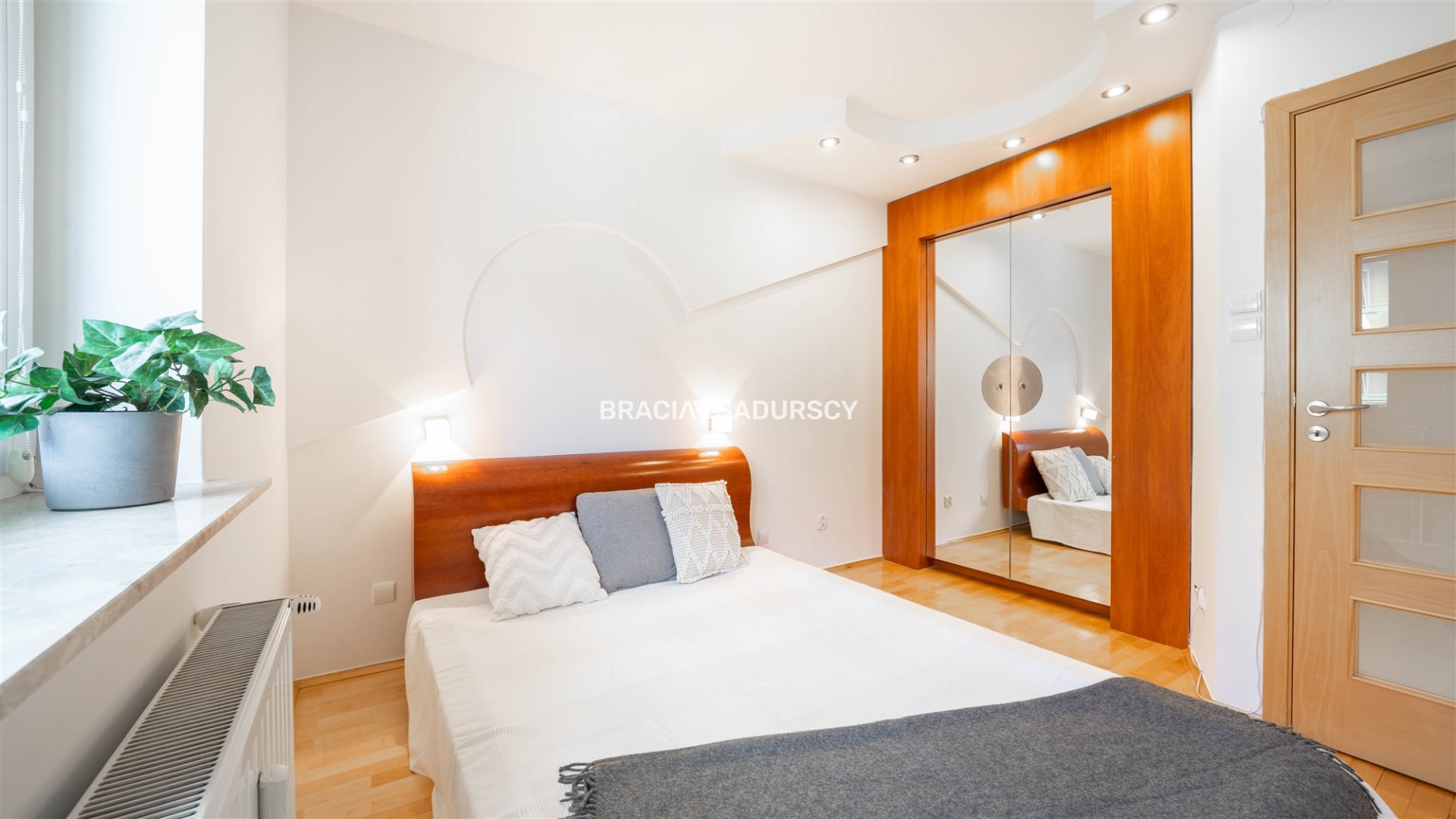 W sypialni pojemna szafa, szafki oraz wygodne łóżko.
