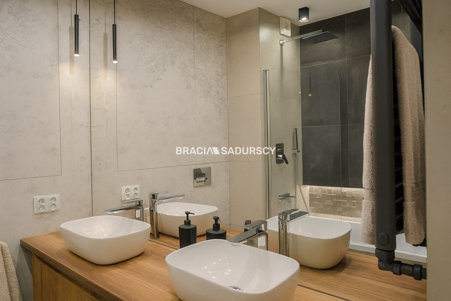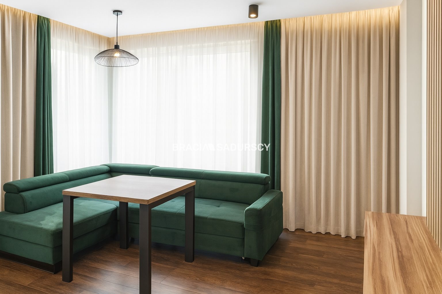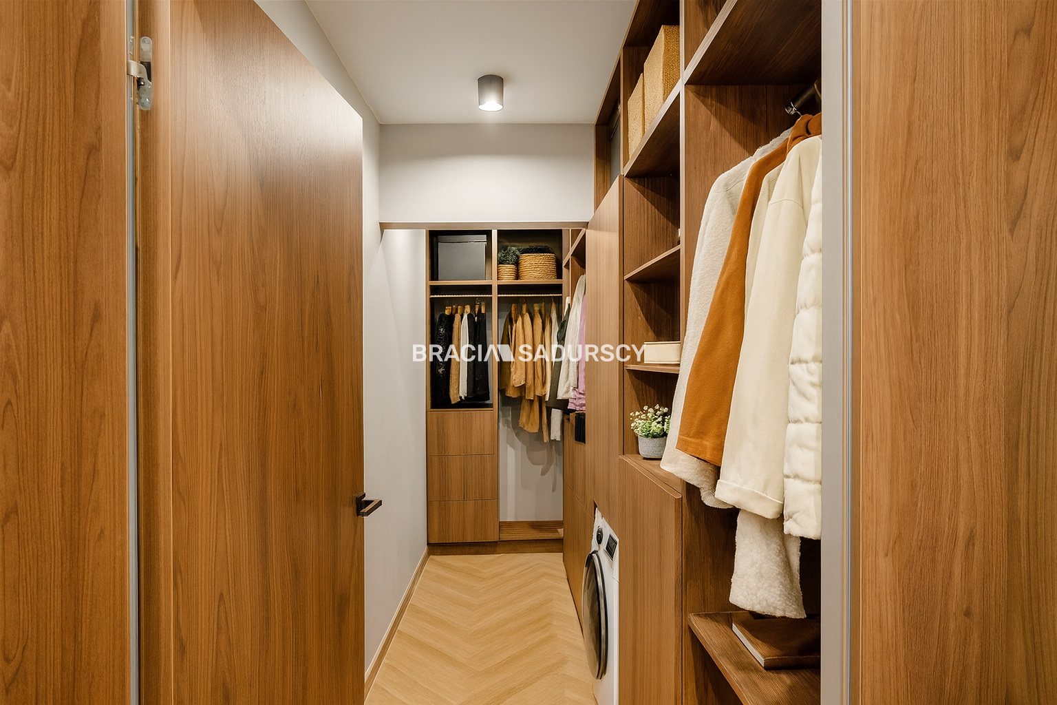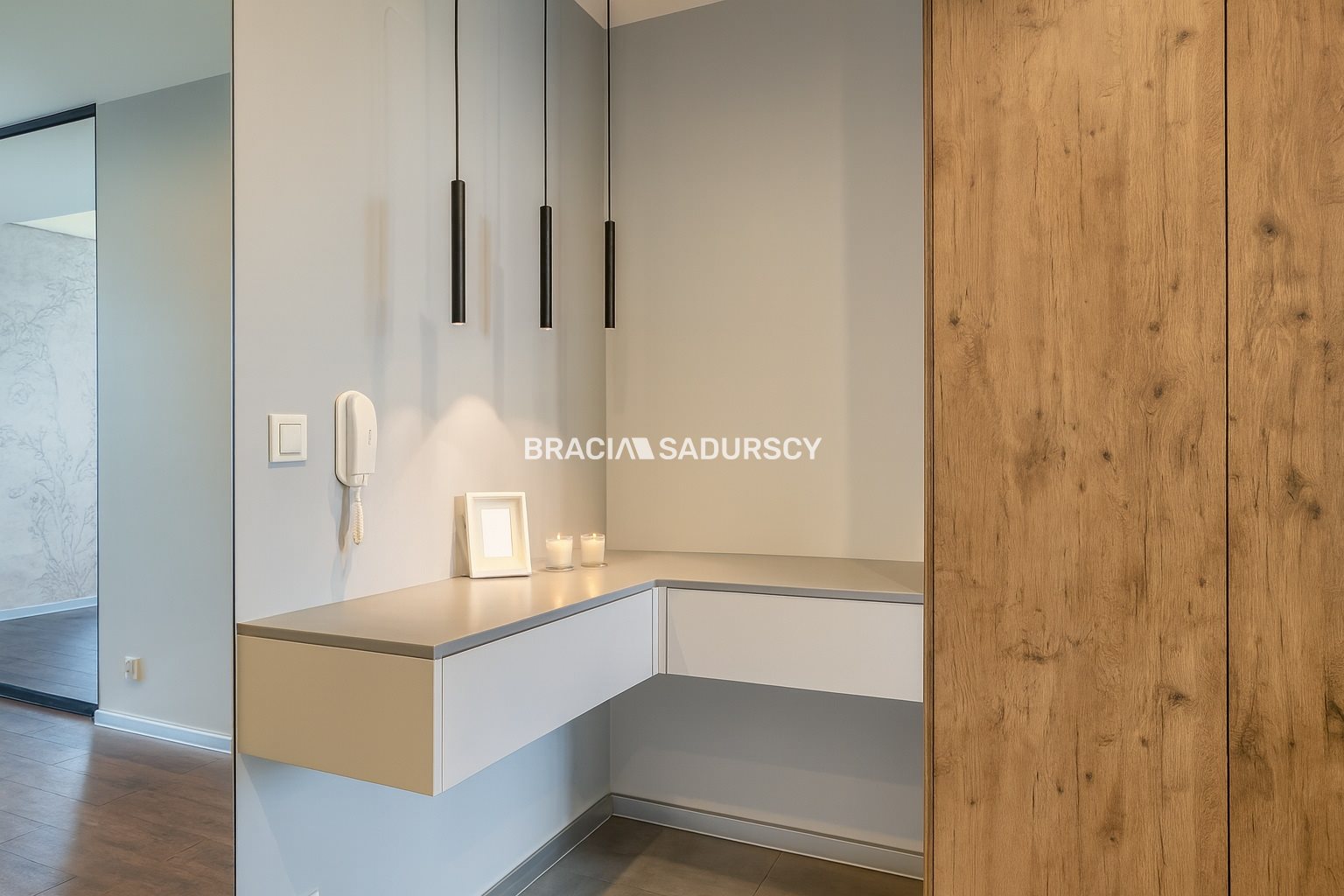 Mieszkanie położone jest na piątym piętrze. Ma widok na panoramę miasta dzięki sporemu oddaleniu od okolicznych budynków. Od razu po wejściu do mieszkania widać, że zostało zaprojektowane i wykończone z gustem, a przede wszystkim - praktycznością. Przy wejściu do mieszkania mamy okazałą garderobę oraz szafę zrobioną na zamówienie. Drzwi do pomieszczeń zostały ukryte za tapetą, która jest motywem powtarzającym się i tworzącym spójną całość wykończenia.