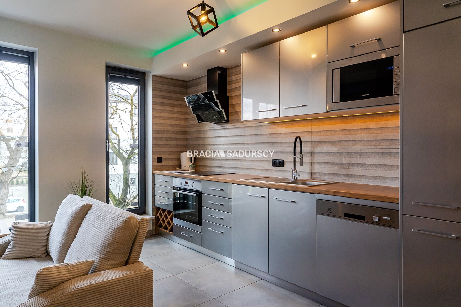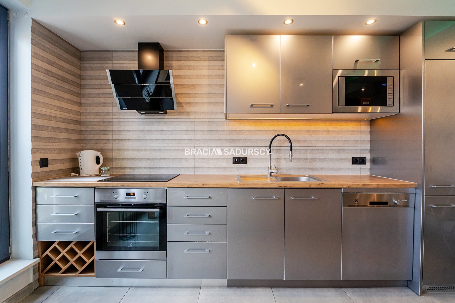 Kuchnia z nowoczesną zabudową ze sprzętem AGD (płyta indukcyjna, piekarnik, mikrofalówka, lodówka z zamrażarką, zmywarka,okap).