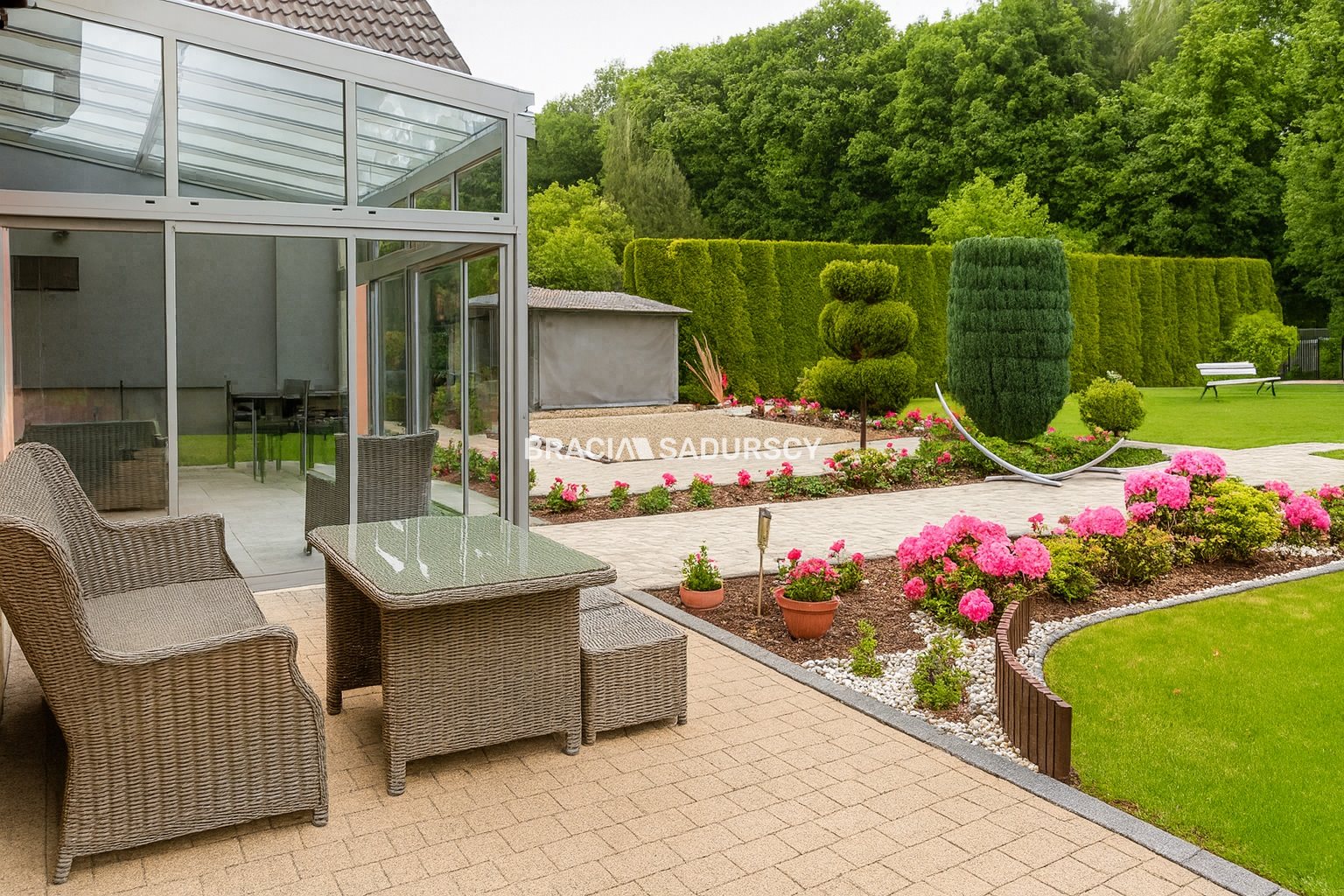 - zadbany, zagospodarowany ogród: drzewa, tuje działka ogrodzona