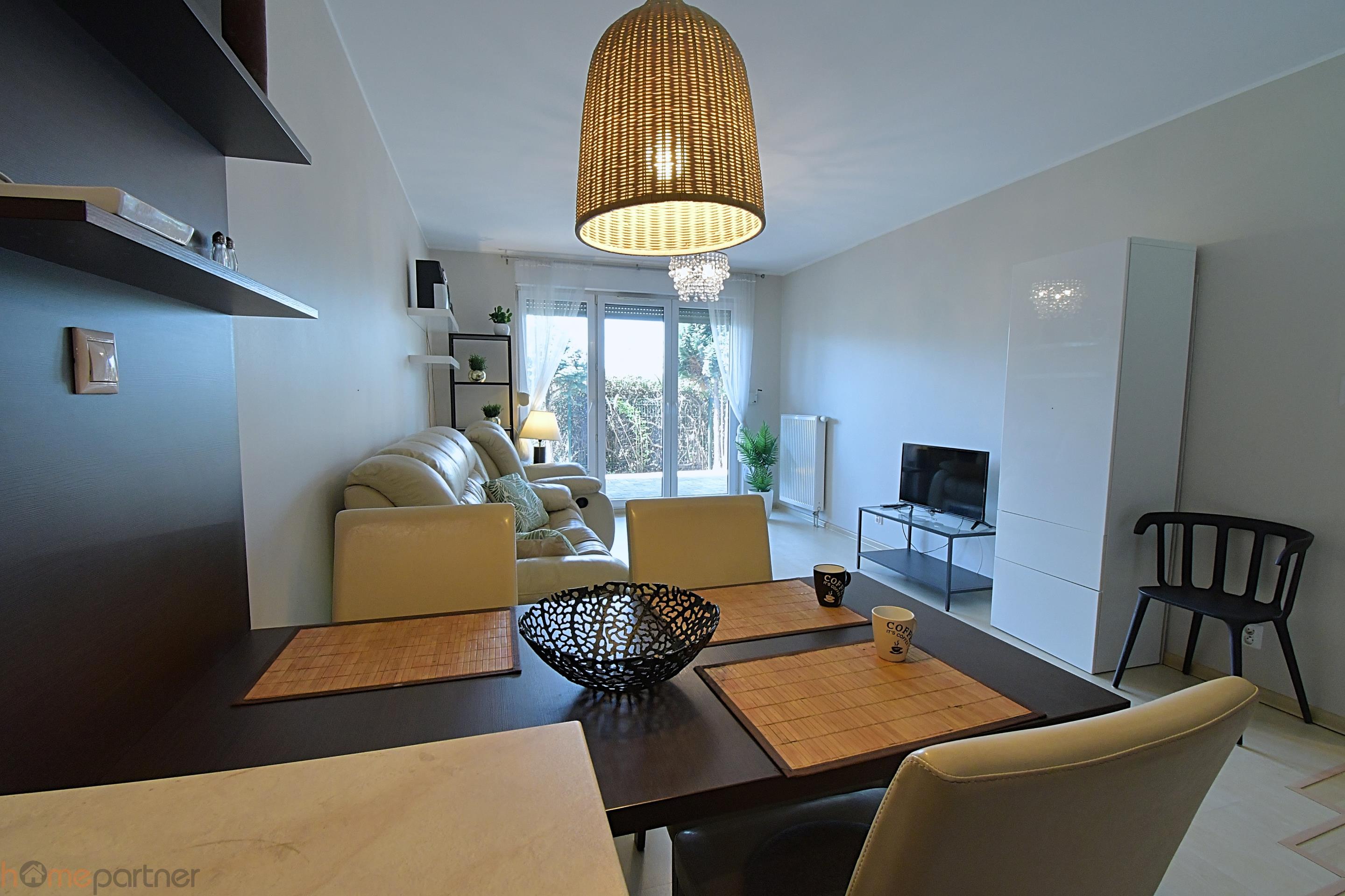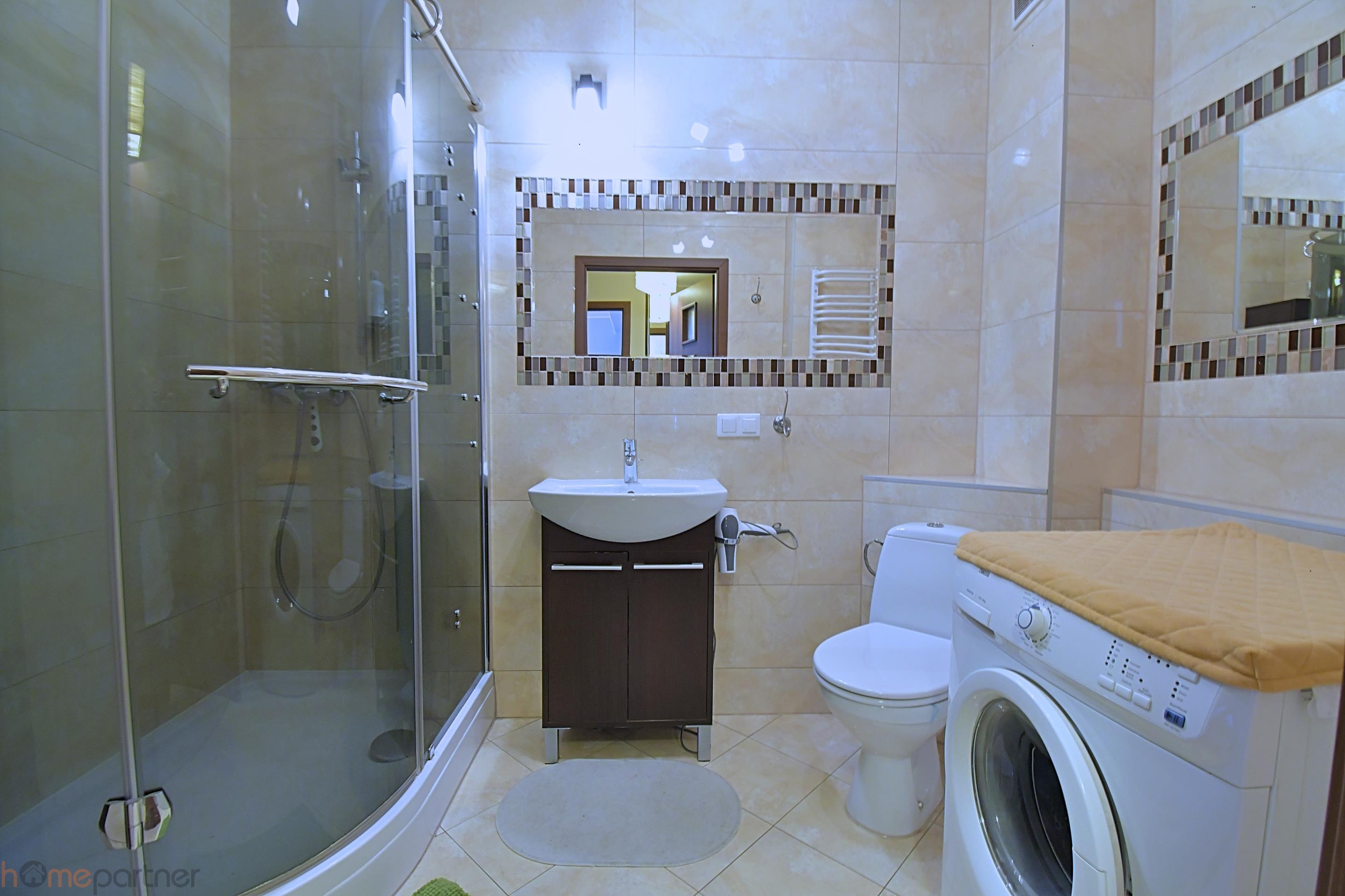 Mieszkanie jest umeblowane i zaaranżowane. Kuchnia w zabudowie wyposażona w lodówko-zamrażarkę, płytę, mikrofalówkę, okap. Łazienka z natryskiem, pralka na wyposażeniu.
