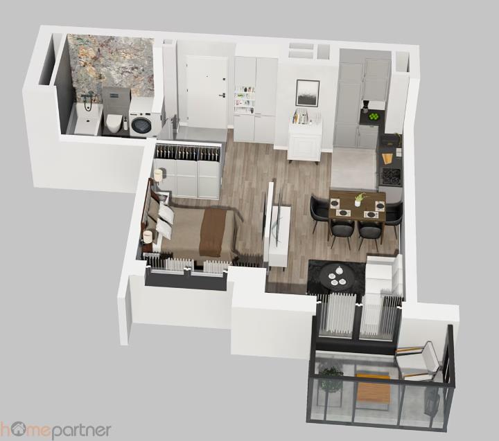 - salonu z aneksem kuchennym oraz możliwą do wydzielenia przestrzenią sypialnianą 30,35 m2