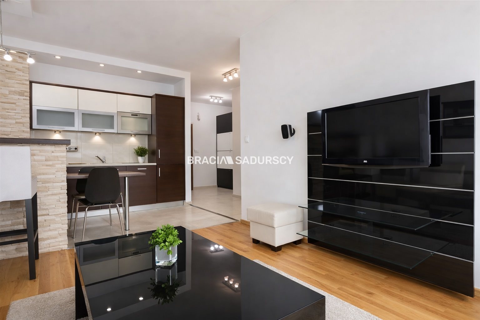 salon z aneksem kuchennym i wyjściem na balkon