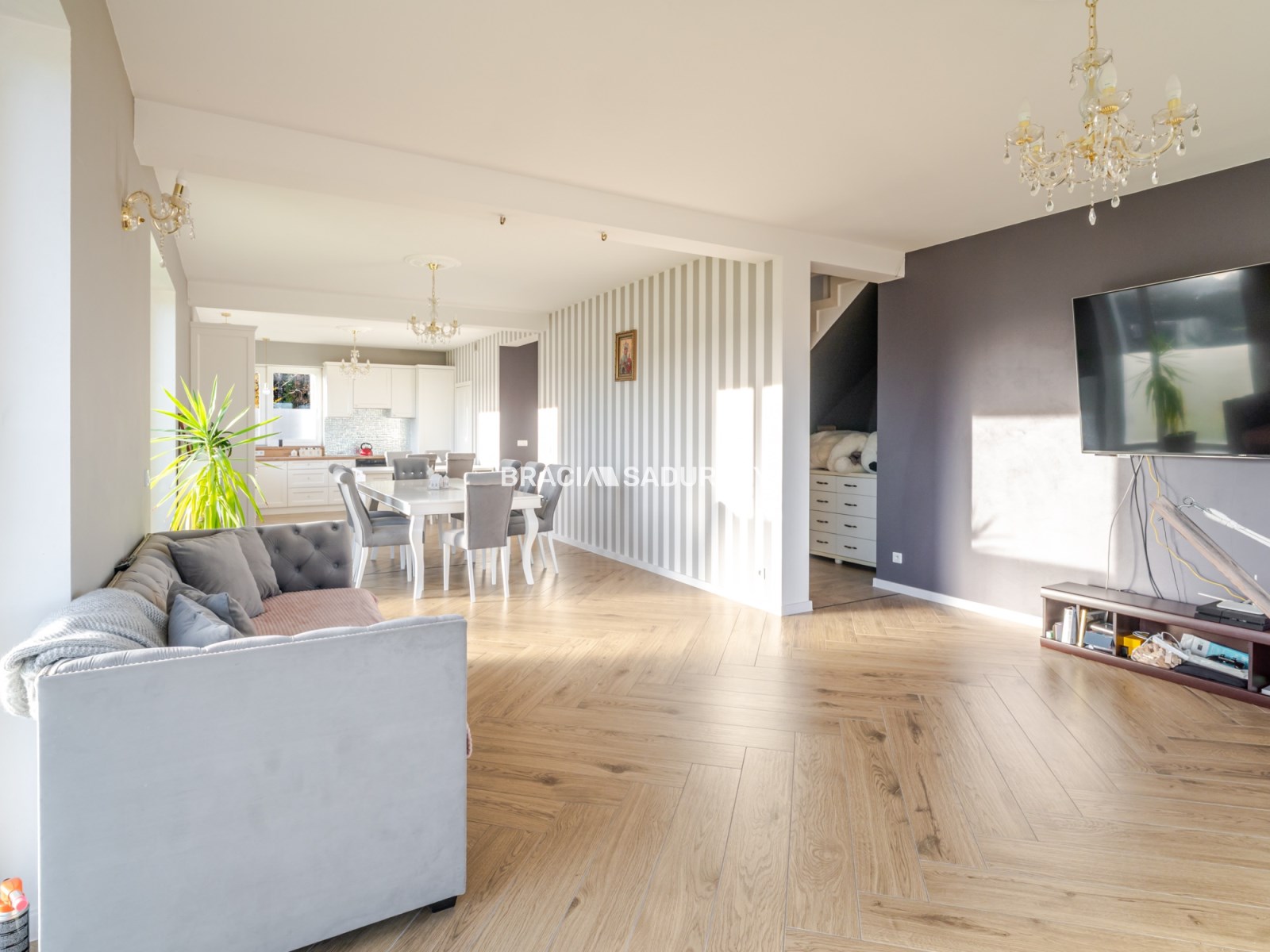 Na parterze gres imitujący drewniane deski świetnie się sprawdza, kiedy podłogówka pracuje lub w przypadku zwierząt domowych, na piętrze w pokojach panele podłogowe.