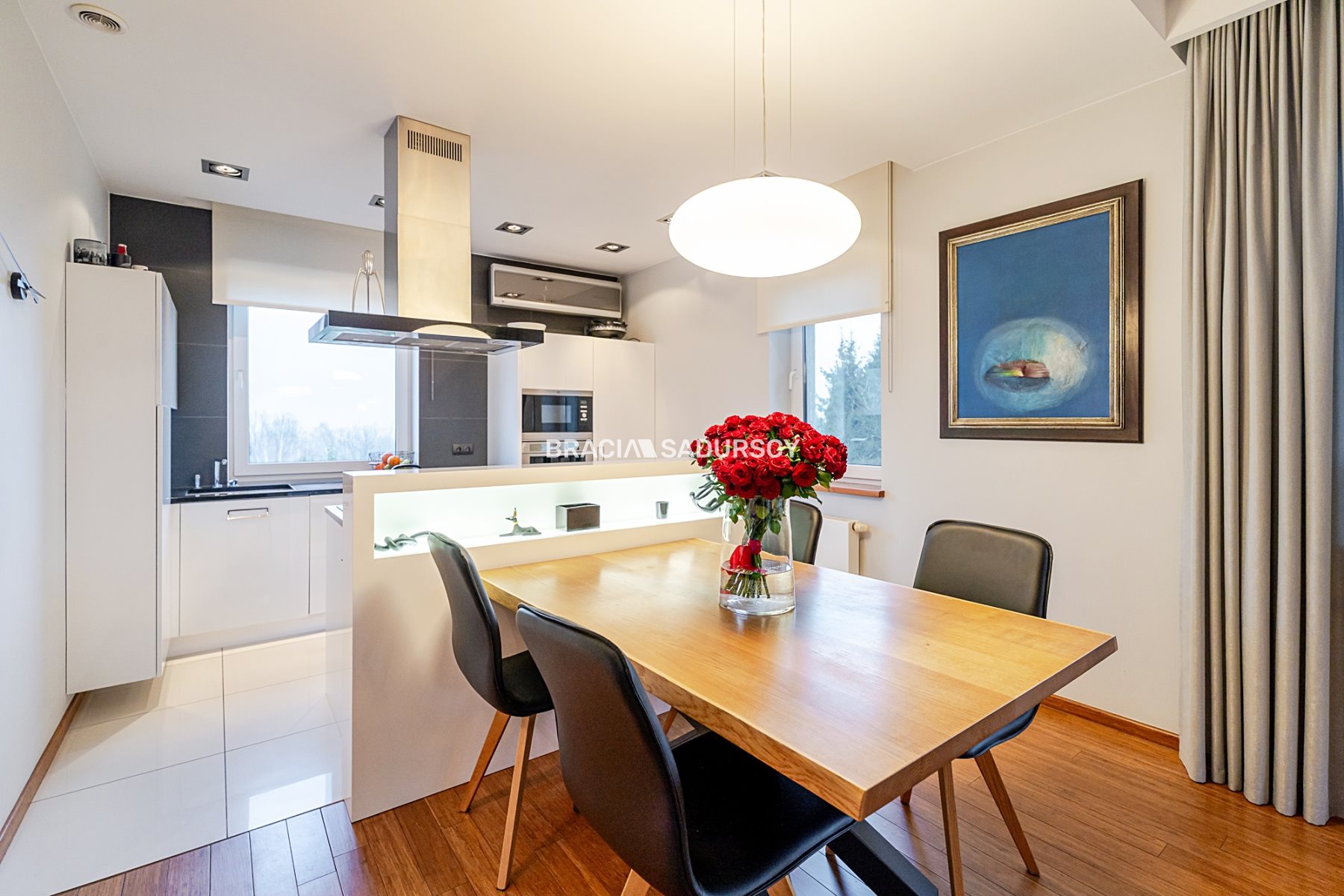 - w kuchni pełna zabudowa z wszystkimi potrzebnymi sprzętami: płyta ceramiczna, zmywarka, lodówka z zamrażarką, wyciąg kuchenny, blaty granitowe