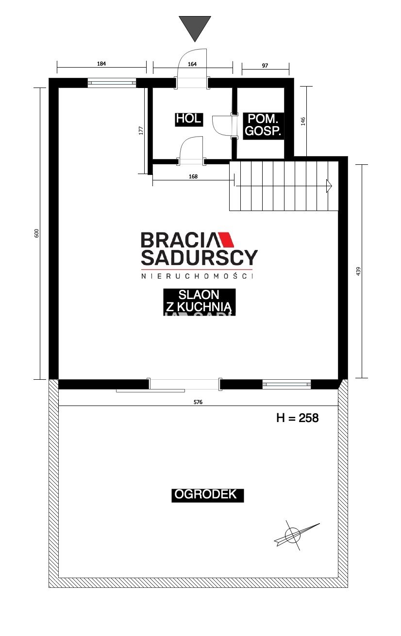 - na parterze z dużego pokoju typu salon o powierzchni ok. 25 m2 z półotwartą kuchnią o powierzchni 3m2, pomieszczenia gospodarczego ( garderoba lub docelowa toaleta) oraz wiatrołapu