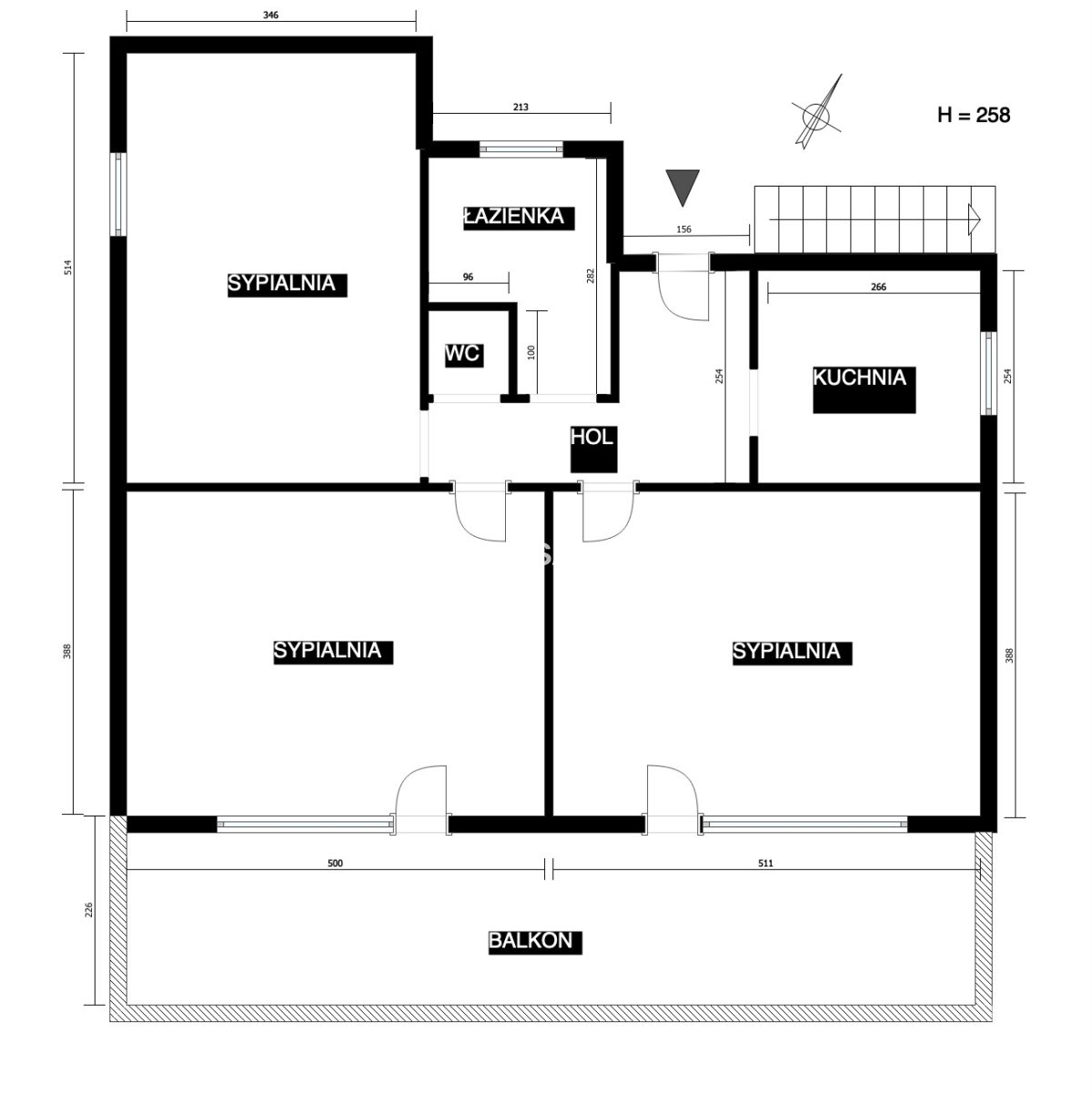 pokój 18 m2, pokój 19 m2, pokój 19 m2, kuchnia 7 m2, łazienka i wc ok. 6 m2, przedpokój 7,5 m2