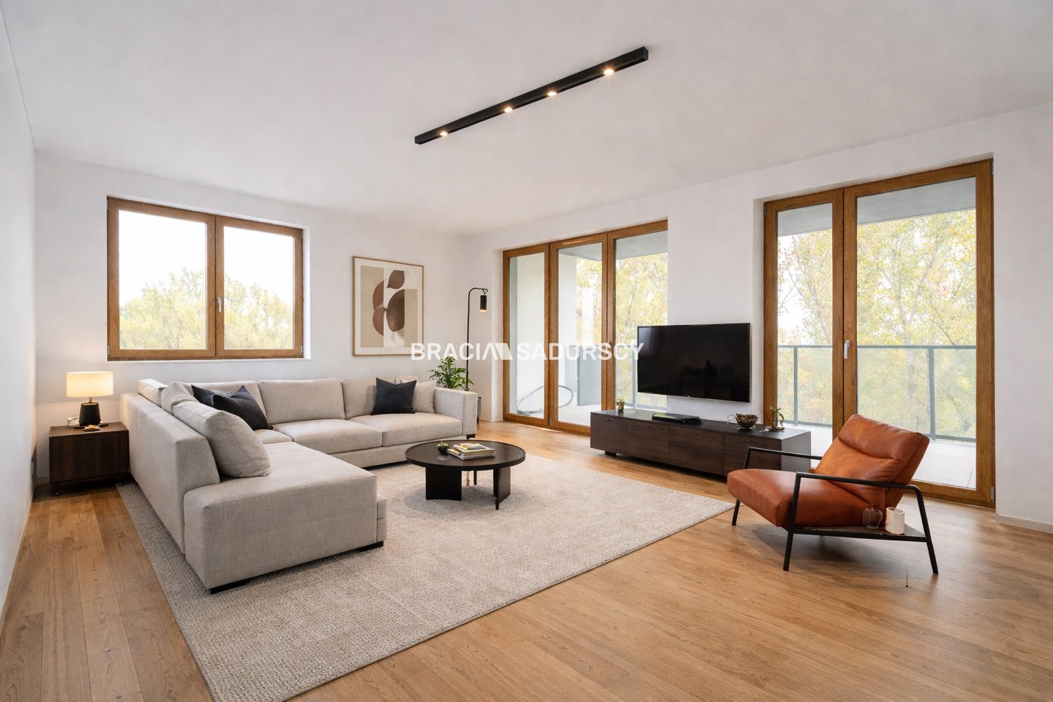 W salonie duża, piękna przestrzeń, z miejscem na przestronną kuchnię, duży rodzinny stół oraz wygodny zestaw wypoczynkowy, bezpośrednie wyjście na duży taras, gdzie szum drzew będzie wspaniale umilał czas tam spędzony. Dodatkowo