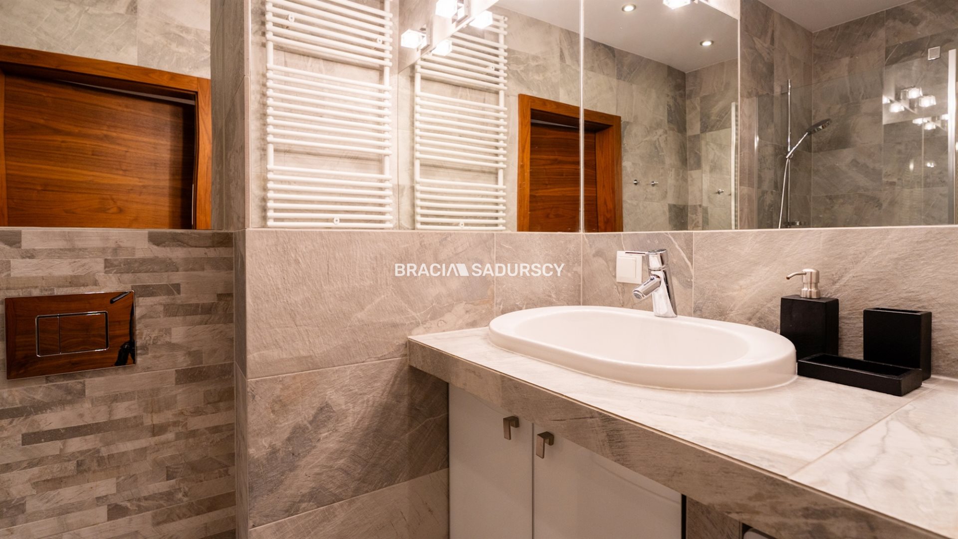 Mieszkanie wykończone w wysokim standardzie - na podłogach naturalne panele z orzecha amerykańskiego oraz gres, ogrzewanie miejskie + ogrzewanie podłogowe, designerskie oświetlenie i zabudowa meblowa wykonana na zamówienie.