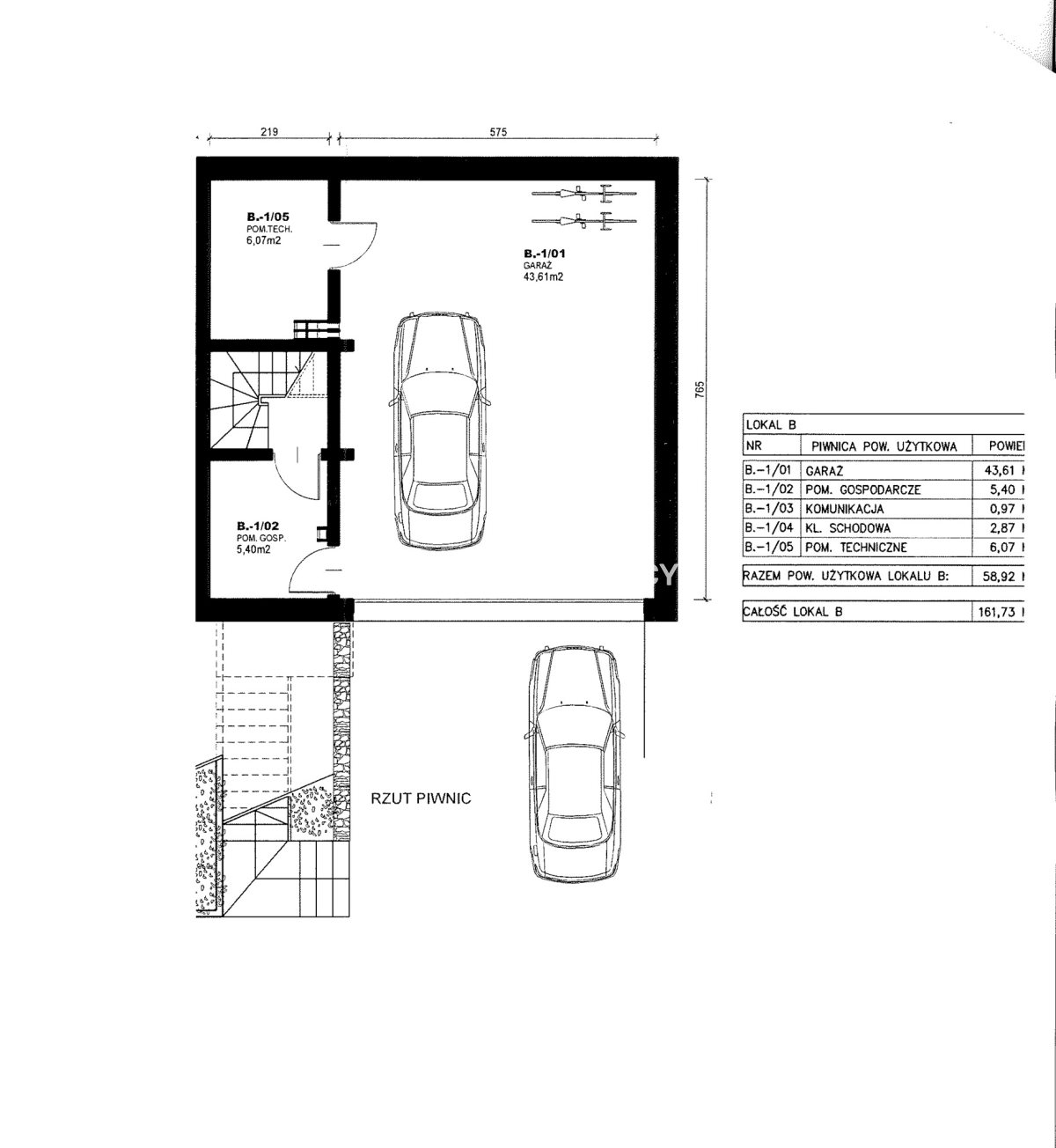 1) piwnica z garażem dwustanowiskowym i pomieszczeniami technicznymi 59m2