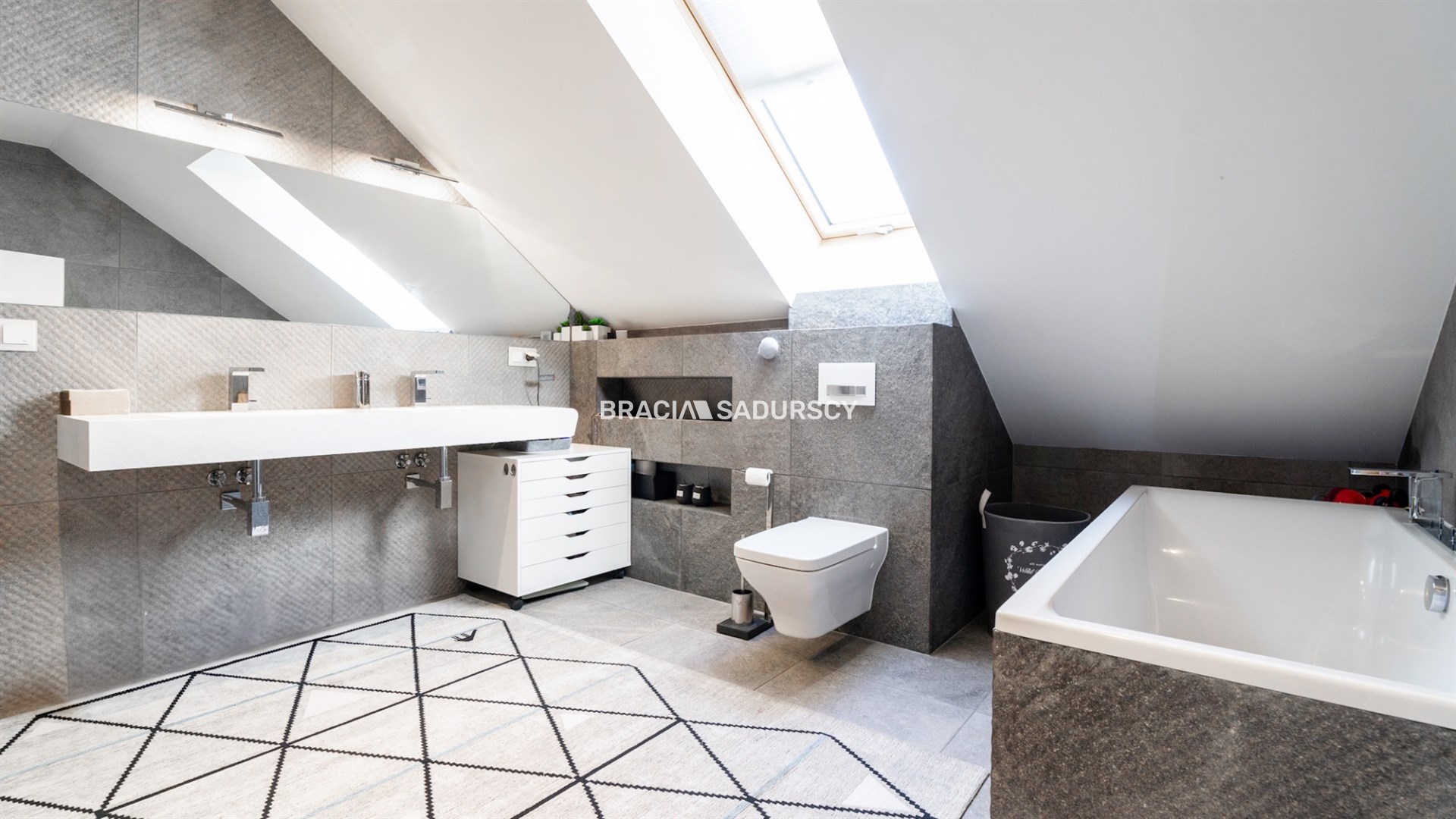 Na pierwszym piętrze znajduje się duża łazienka z oknem z wanną i prysznicem, dwie sypialnie dla dzieci oraz jedna większa sypialnia z wydzieloną garderobą typu walk in.