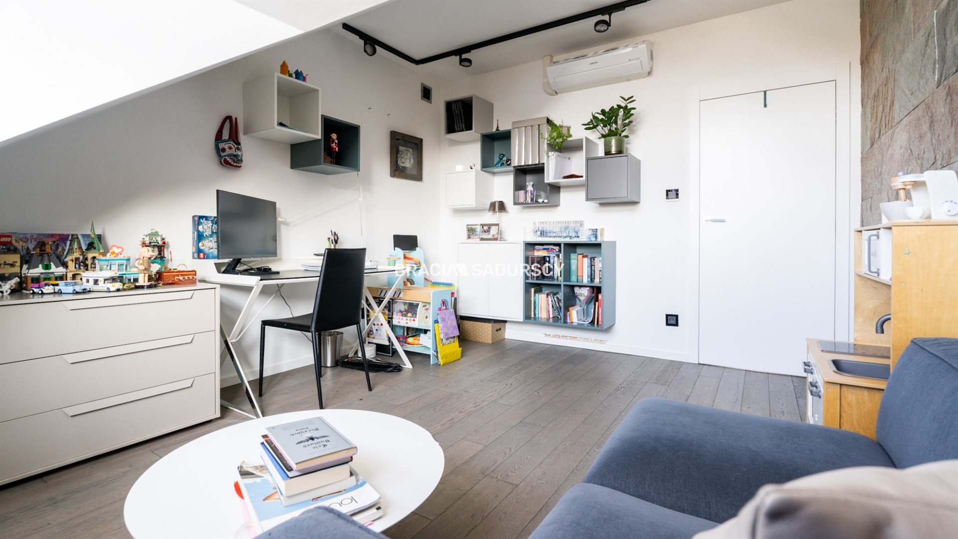 Salon ma dostęp do sporego, intymnego tarasu, wychodzącego na zieleń i graniczącego bezpośrednio z sąsiednią działką, atutem jest brak sąsiadów patrzących w okna.
