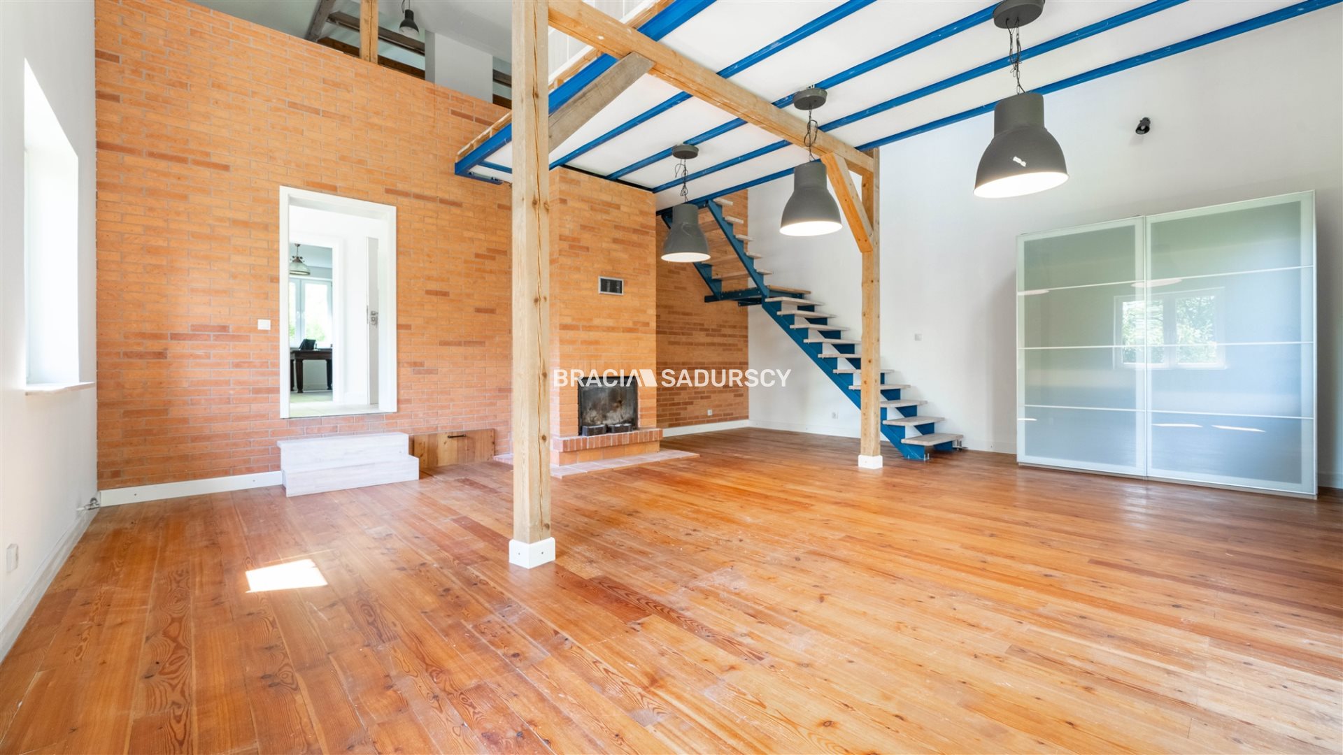 Wnętrza łączą styl loftowy z elementami tradycji - drewniana podłoga z modrzewia, ceglane akcenty przy kominku i przemyślany układ pomieszczeń dają wyjątkowy efekt przytulności i przestrzeni.