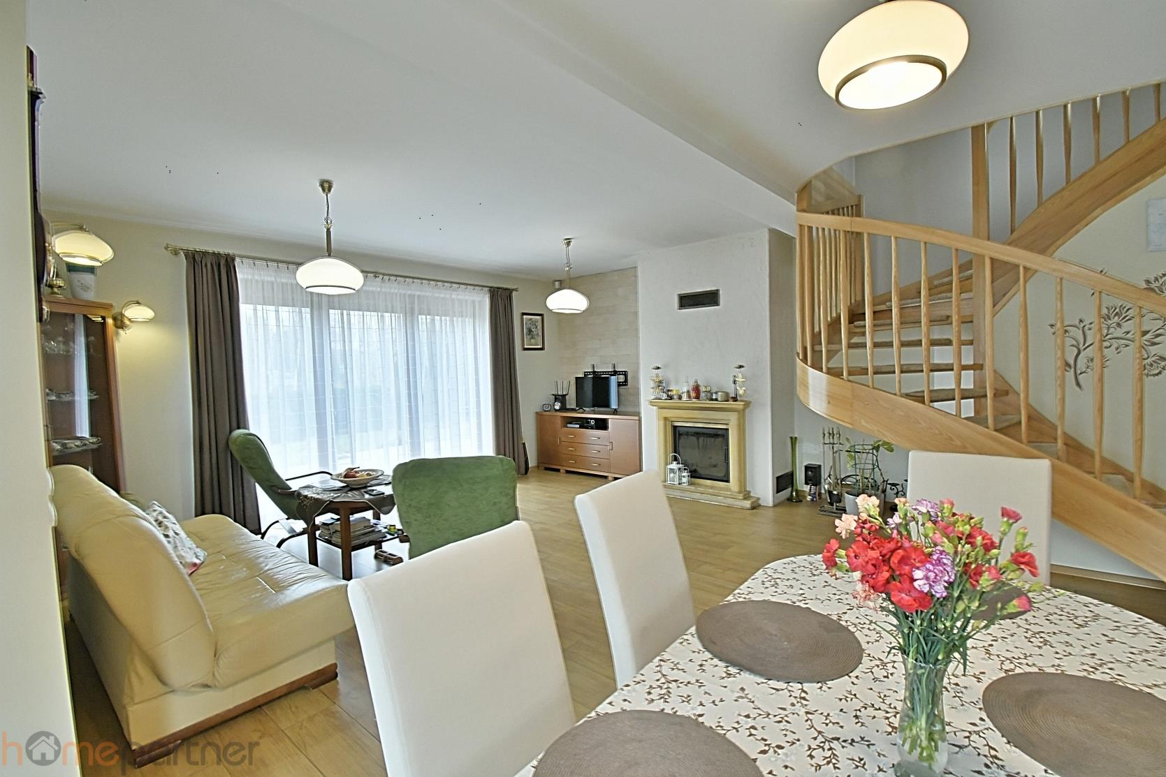 Dom posiada część dzienną złożoną z salonu z kominkiem z płaszczem wodnym, otwartego na jadalnię i kuchnię, z wyjściem na taras o południowo-zachodniej ekspozycji. Kuchnia w pełni wyposażona - lodówka, piekarnik. zmywarka 60 cm, płyta gazowa. Na dole wc oraz pomieszczenie gospodarcze z piecem gazowym jednofunkcyjnym z zasobnikiem.