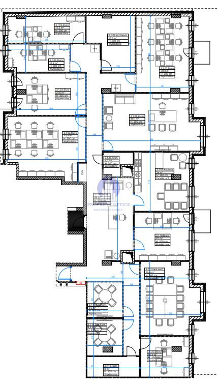 -8 przestronnych gabinetów o różnej wielkości (od małych 2os po open space); 3 z 8 gabinetów mają kontrolę dostępu,