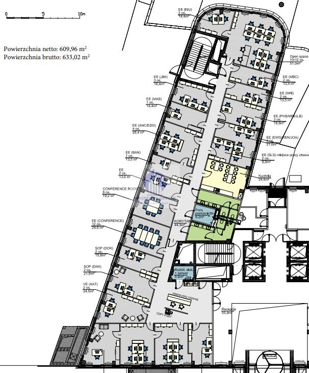 Lokal biurowy w podziale na pokoje biurowe, salki konferencyjne, kuchnie, serwerownię i pomieszczenia pomocnicze,