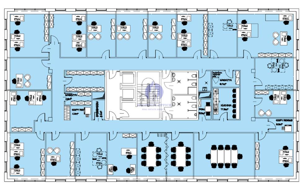 Przestrzeń jest w układzie gabinetowym - zgodnie z załączonym rzutem (rozmieszczeni biurek jest przykładowe, jest możliwość zwiększenia ich ilości).