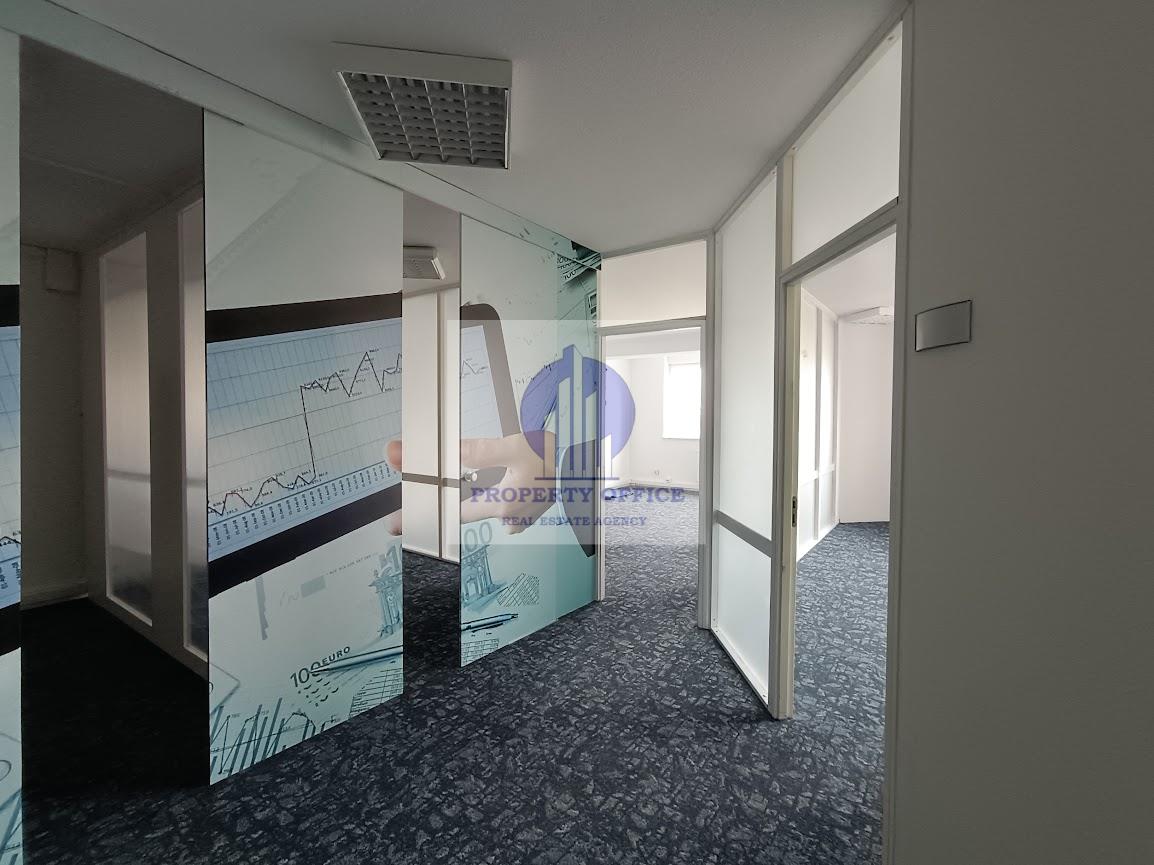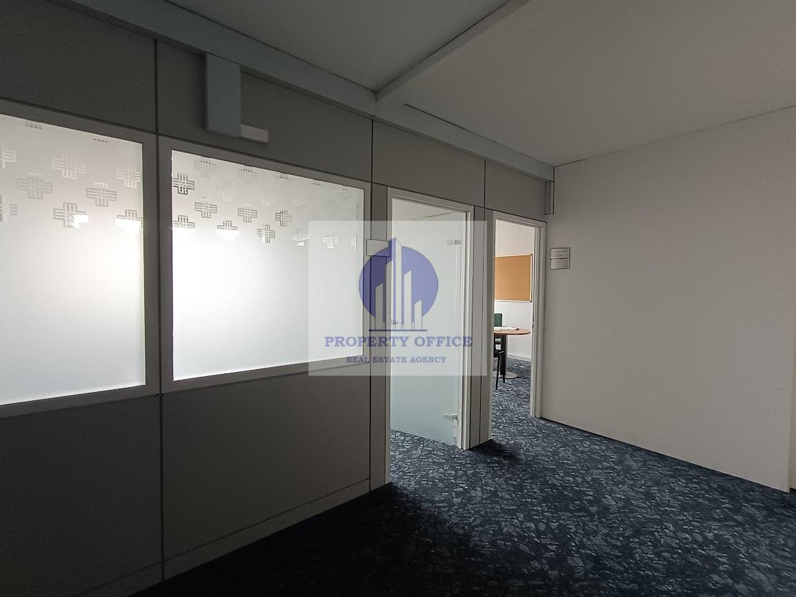 Gabinetowy podział powierzchni.: 3 pokoje biurowe, prywatna łazienka, aneks kuchenny i korytarz.