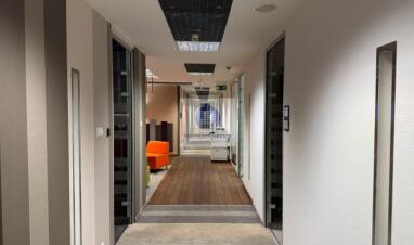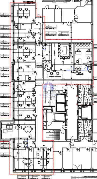 Powierzchnia w układzie gabinetowym: pokoje biurowe, salki, kuchnia, łazienki.