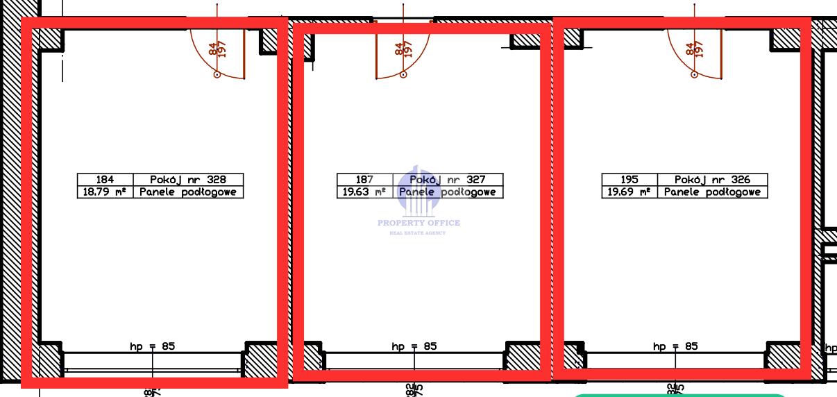 Oferowany lokal biurowy składa się z trzech pokoi sąsiadujących ze sobą.