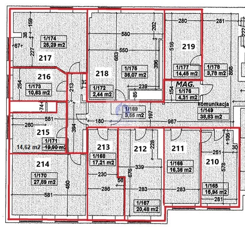 Oferowany lokal biurowy składa się z dziesięciu pokoi biurowych.