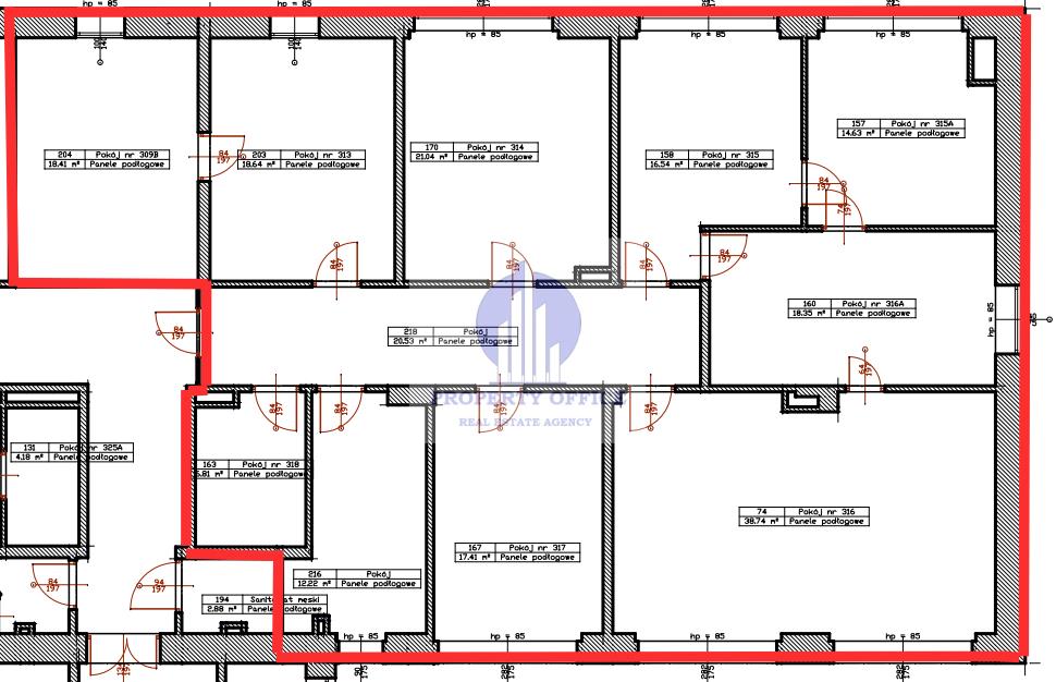 Lokal biurowy składający się z 9 pokoi różnej wielkości.