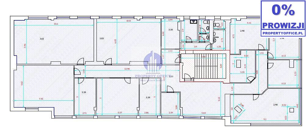 Lokal zajmuje całe piętro i jest podzielony na 13 pokoi biurowych różnej wielkości