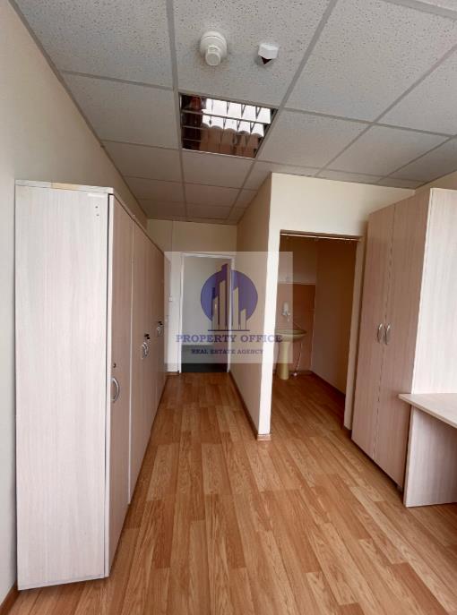 Biuro jest częściowo umeblowane: szafa, biurka, fotele.