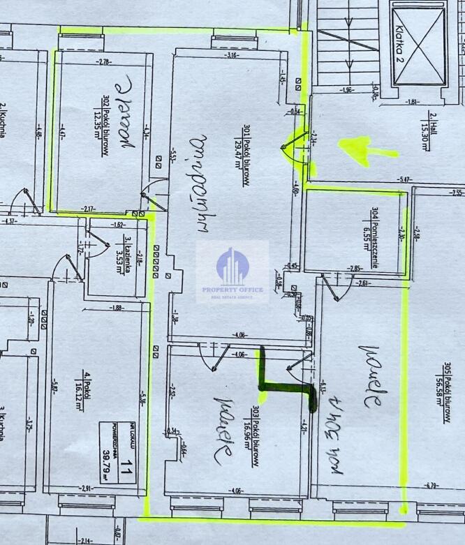Pomieszczenia socjalne (aneks kuchenny, łazienki) znajdują się w częściach wspólnych; z wejściem z korytarza.
